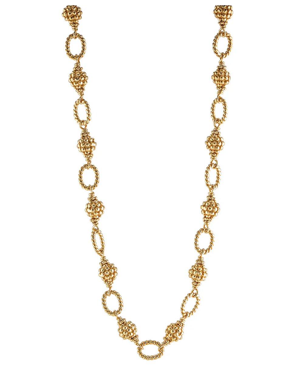 We’ve reimagined the classic necklace chain with some elevated elements—namely our gorgeous golden berries interspersed with ornate links done in our iconic twisting thread. Gloriously versatile, this necklace moonlights as a bracelet when wrapped around the wrist three times or can be transformed into a lariat style. This piece is designed for layering and easily works with any pendant. Just like all women, this necklace can do it all while emanating beauty