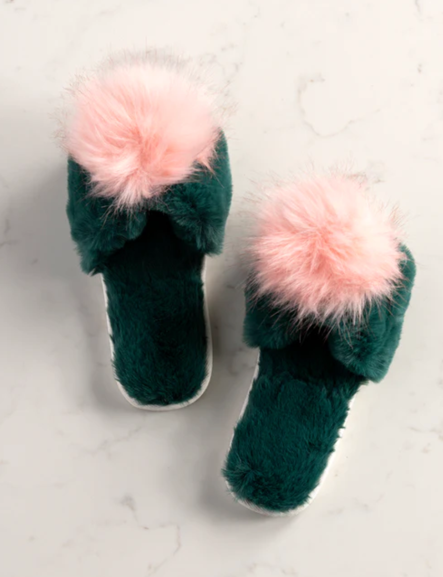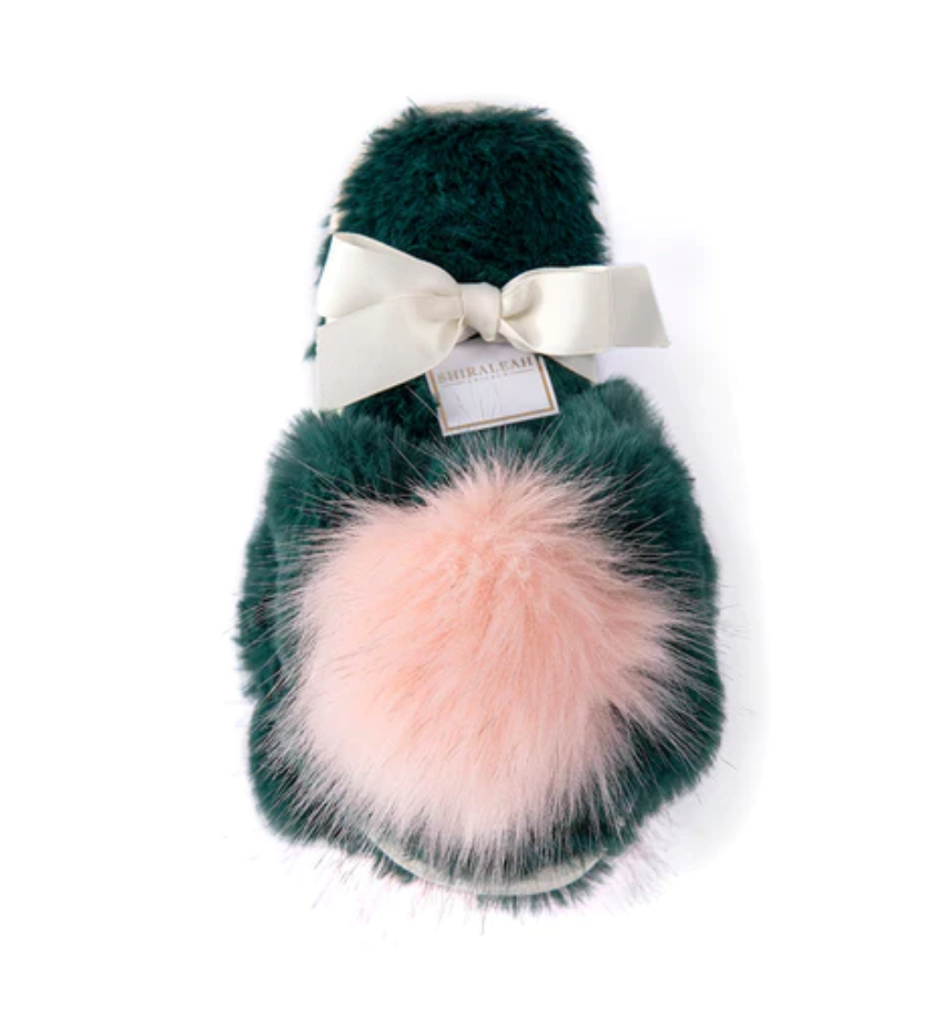• Cozy never looked so glamorous in Shiraleah’s Amor Slipper. These slippers feature a plush green texture supported by a rubber sole bottom, making them perfect for wandering around the house or a quick trip to the mailbox. The Amor Slipper has a posh pink pom-pom that rests upon its band adding an extra flair to this classic slide silhouette. Pair with other items from the Shiraleah collection to complete your look!