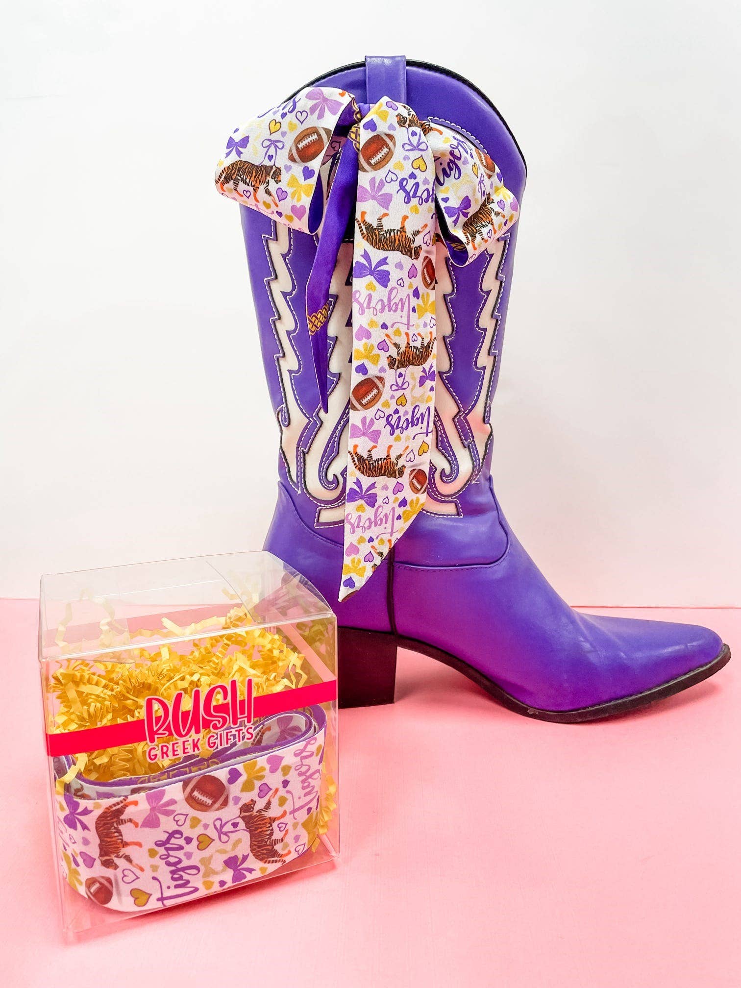 It's the perfect gameday and any day accessory! Our Arkansas Twilly Scarf is 35"L by 1 7/8"W and made with 12 mm silk. It can be worn on purse straps, boots, the wrist and hair! The scarf comes packaged in a 4x4" box with colored shred ready to hit your sales floor!