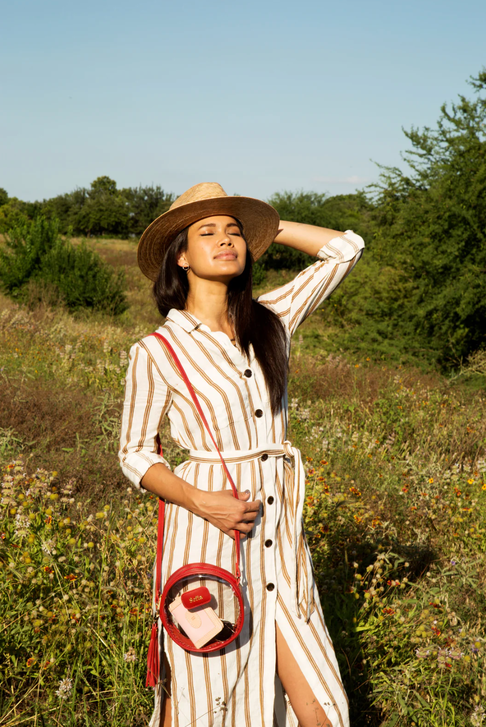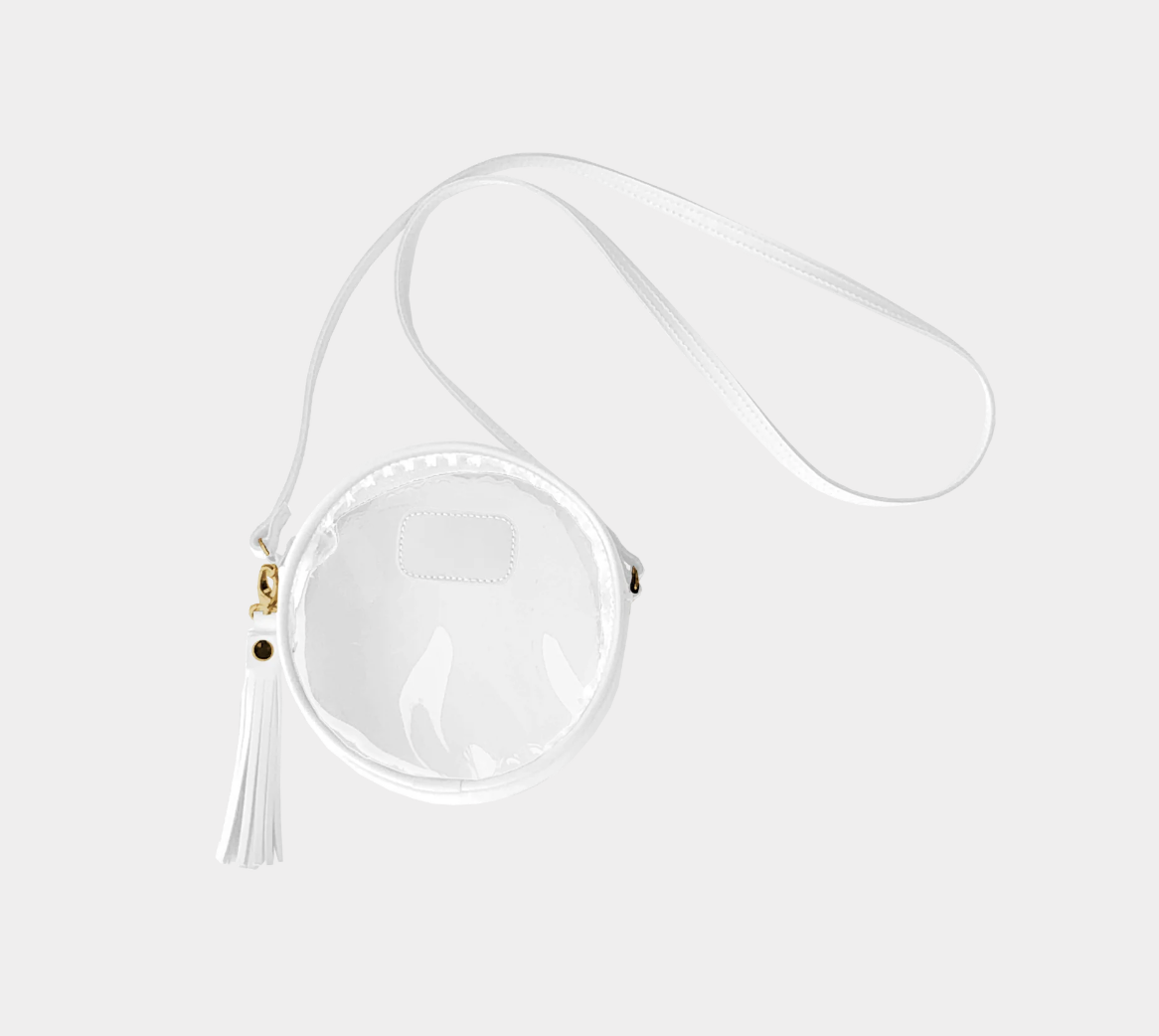 This unique geometric bag is perfect for when you something more than a little different. This stadium compliant bag has plenty of room for essentials and adds a little extra pizazz with a detachable leather tassel. Perfect for concerts and sporting events.