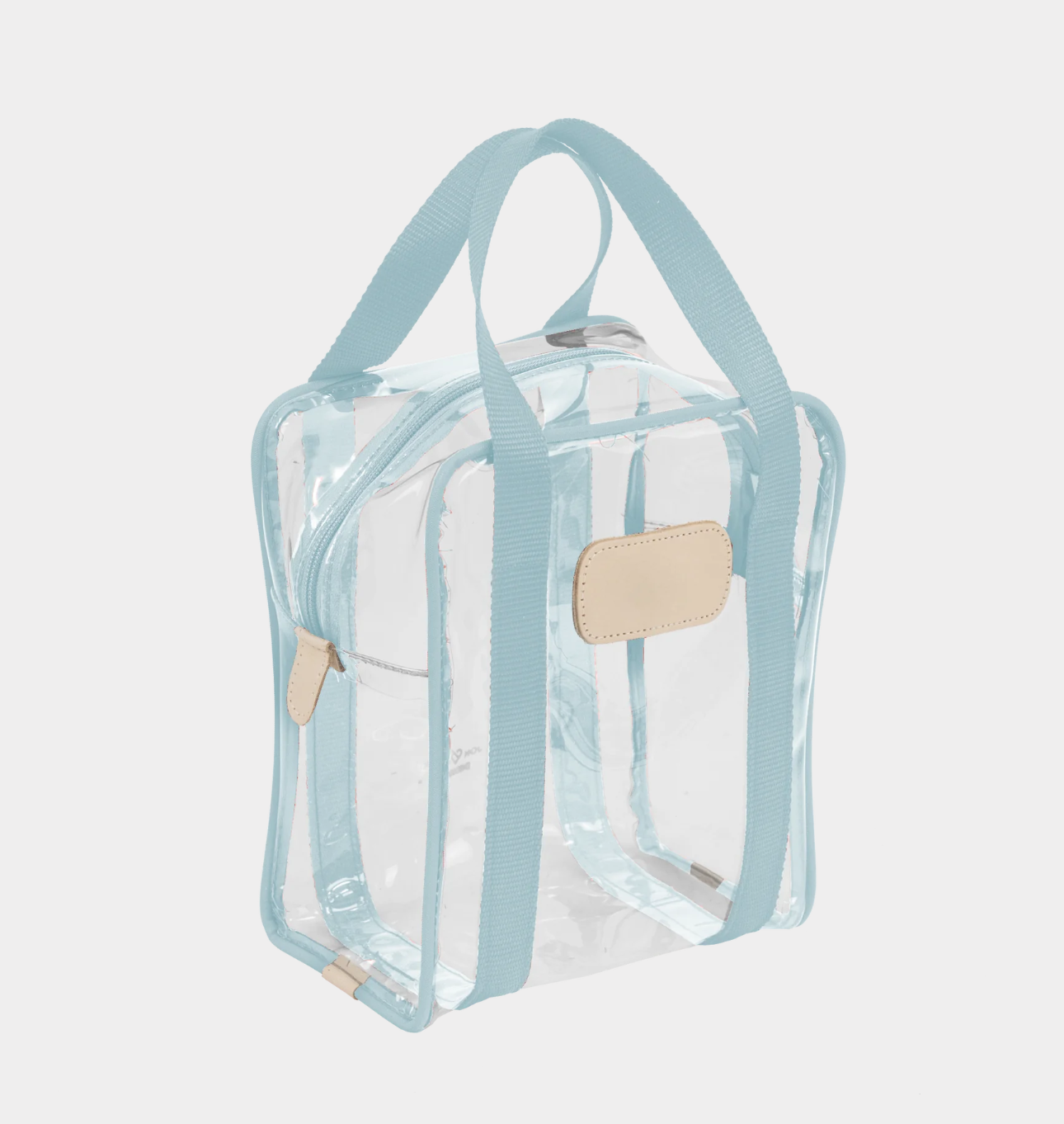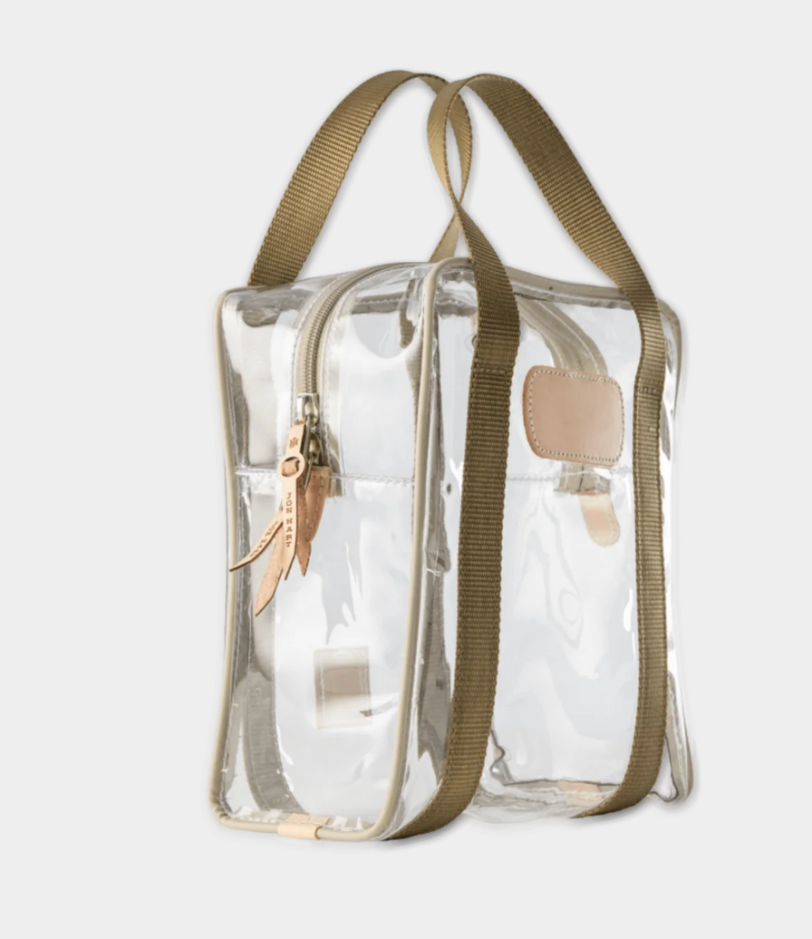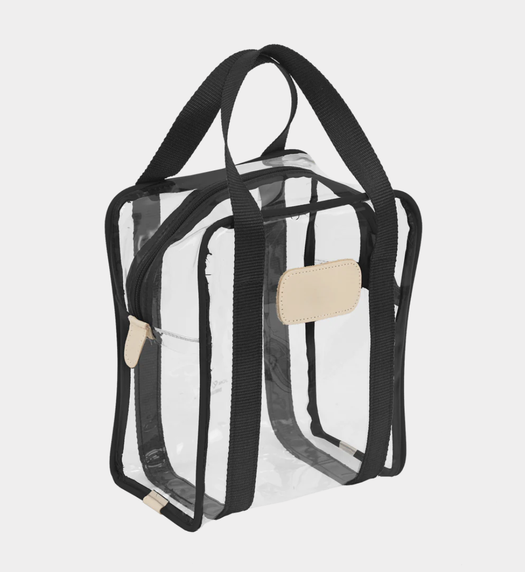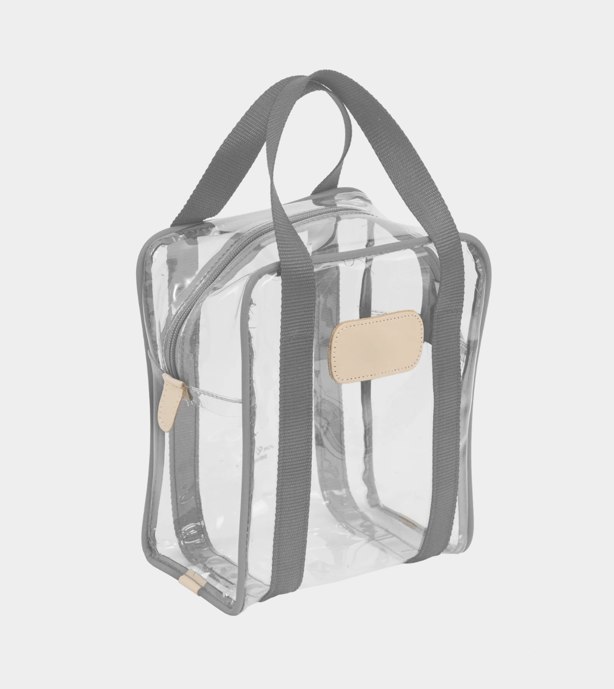 Clear Plastic material with Coated canvas Trim and a Natural Leather Patch Webbing handles that extend to the base Zippered closure with silver hardware Bag Dimensions (inches): 11h x 8.5w x 6d