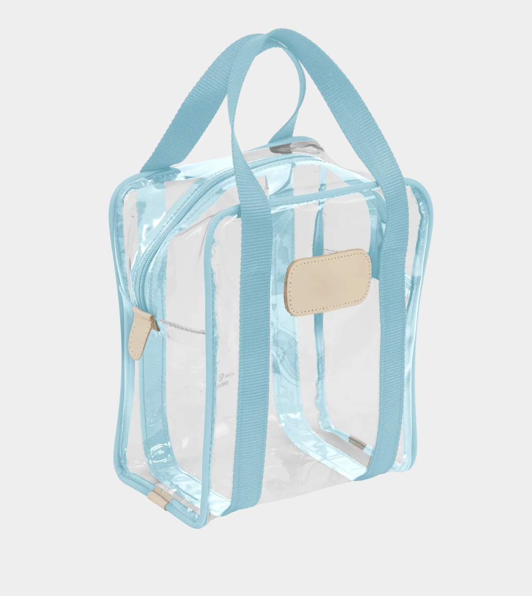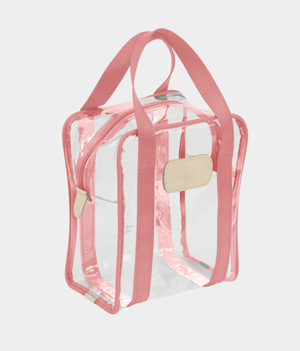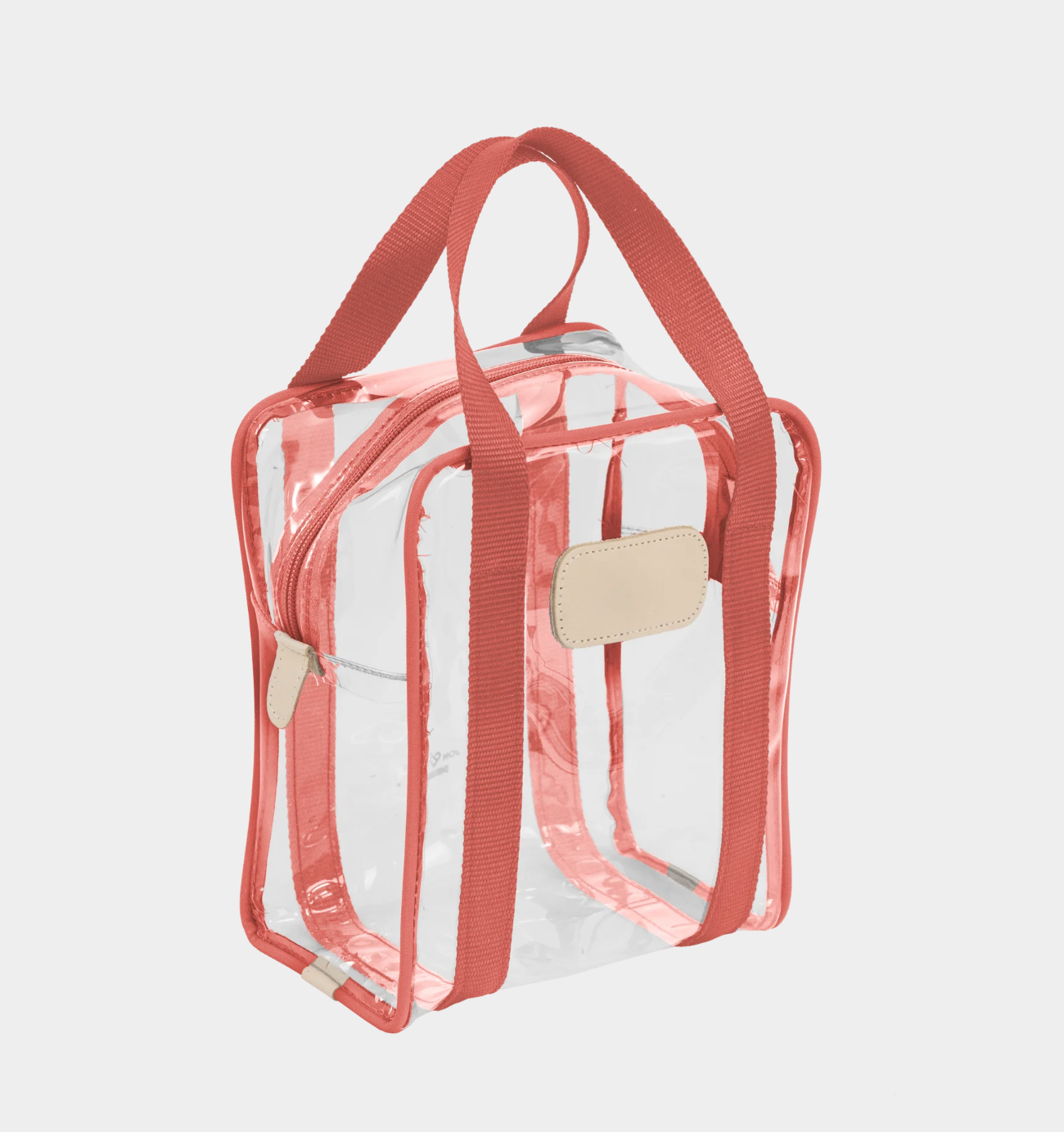 Clear Plastic material with Coated canvas Trim and a Natural Leather Patch Webbing handles that extend to the base Zippered closure with silver hardware Bag Dimensions (inches): 11h x 8.5w x 6d