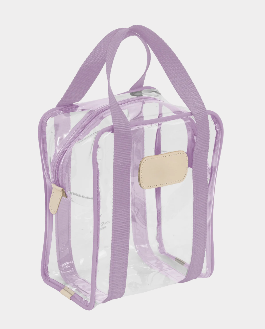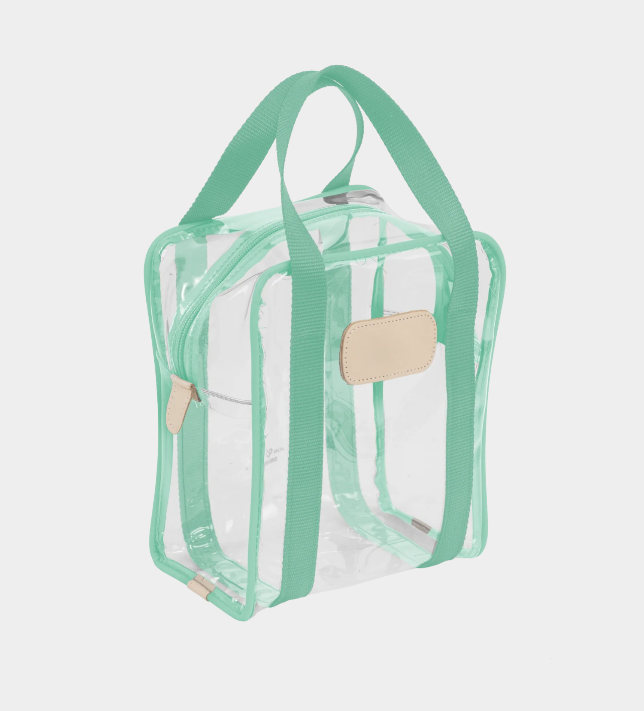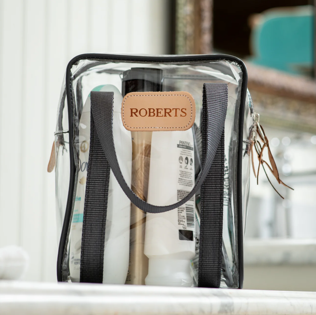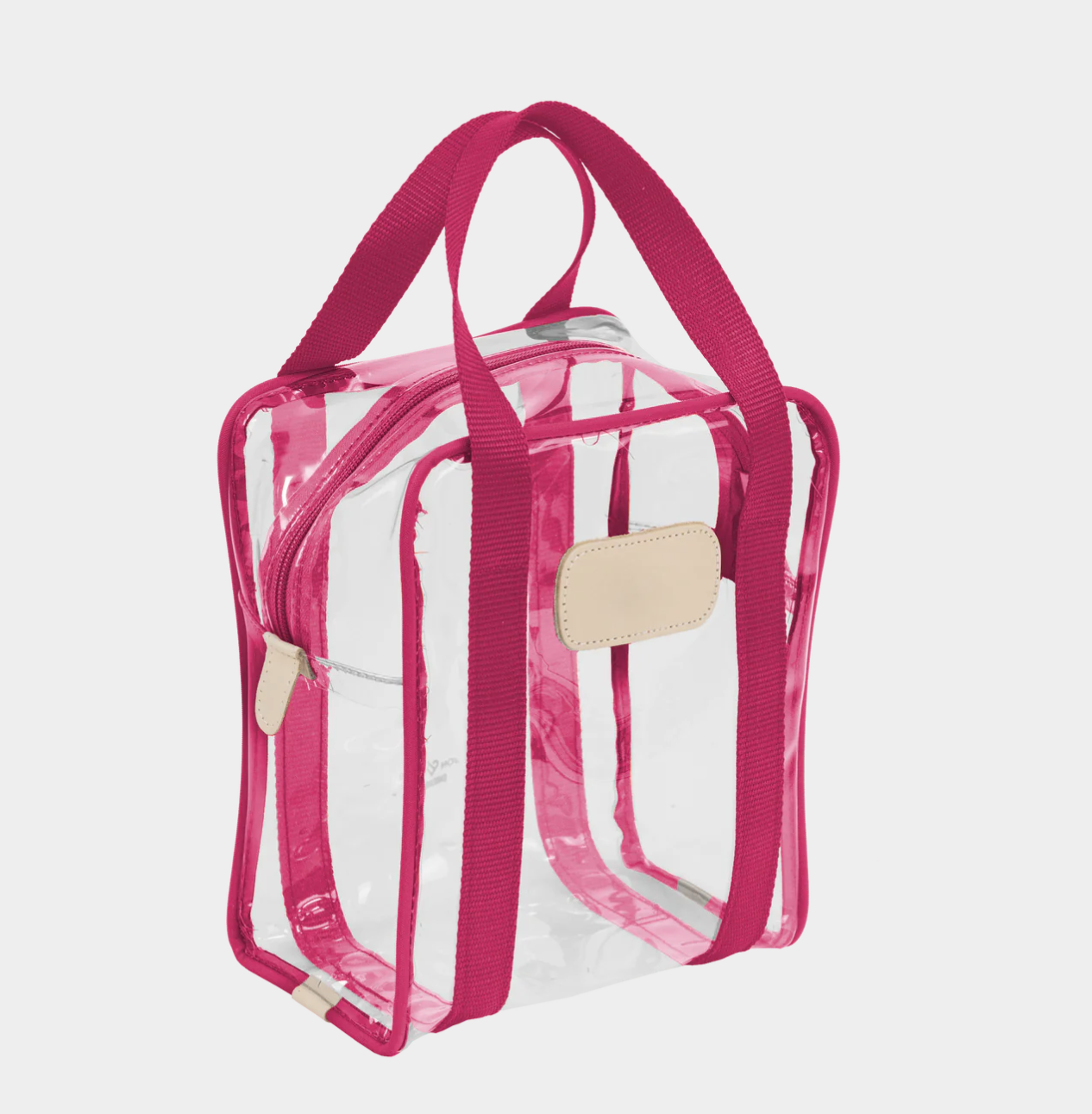Clear Plastic material with Coated canvas Trim and a Natural Leather Patch Webbing handles that extend to the base Zippered closure with silver hardware Bag Dimensions (inches): 11h x 8.5w x 6d