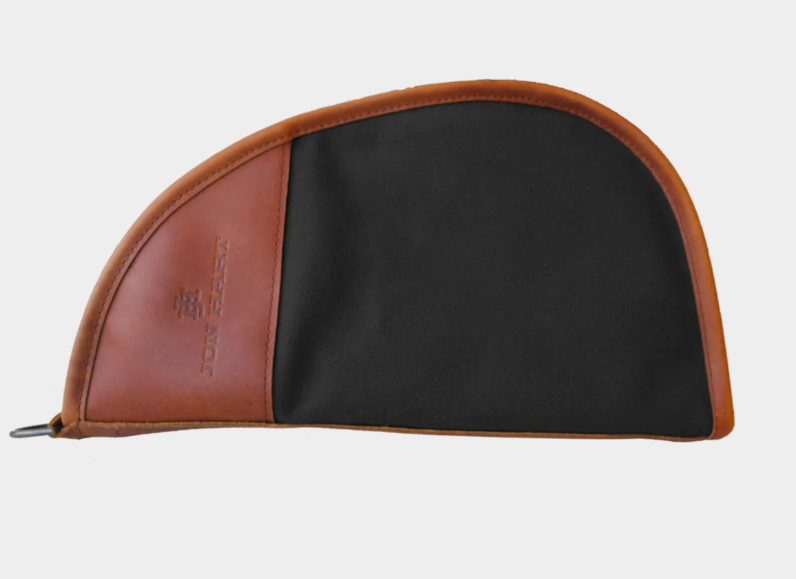 Coated Canvas with Oiled Leather trim. Fully lined in fleece for protection. Zippered closure with antique brass hardware. Accommodates most pistols and revolvers. Features a barrel end pocket protector. Antique Brass D-Ring to hang for easy storage.