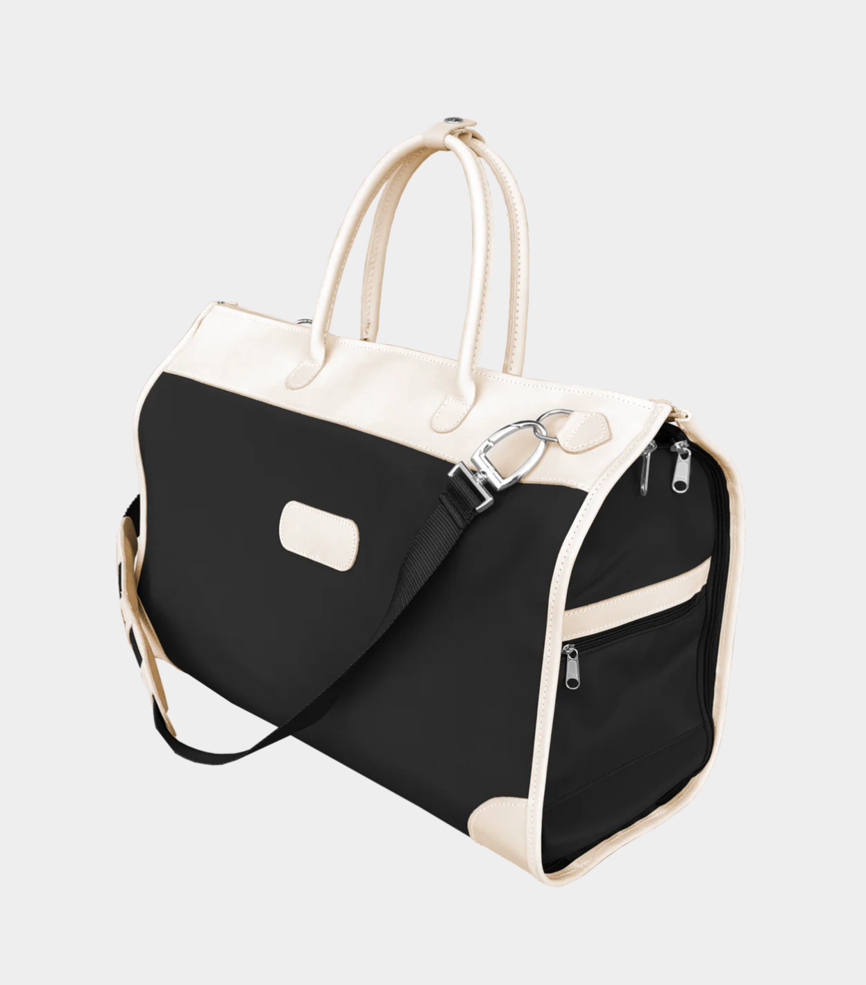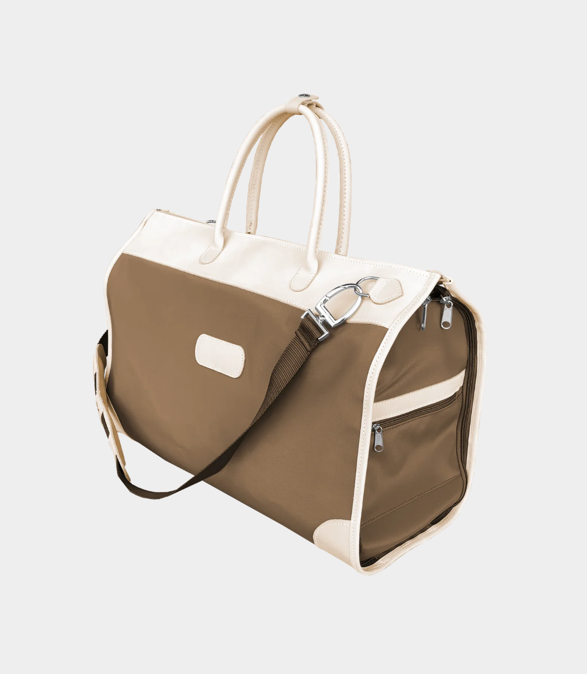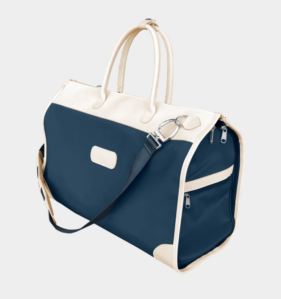 Our must-have for travelers, this stylish carry-on compliant duffel bag fully unzips to convert into a hanging garment bag. Includes rolled leather handles, as well as an adjustable shoulder strap for comfort carry. Zippered exterior pockets on both ends & elastic interior pockets for shoes, socks, or undergarments. The zippered exterior pockets on the back of the bag double as a trolley sleeve. Comfortably fits up to 5 hanging garments in the garment sleeve. Comes with a removable hook for easy storing over any door. An elegant duffel bag when you need to carry it, a garment bag when you need to hang it, and folds completely flat when you need to stow it, the Southtown has plenty of room for all of your weekend essentials.