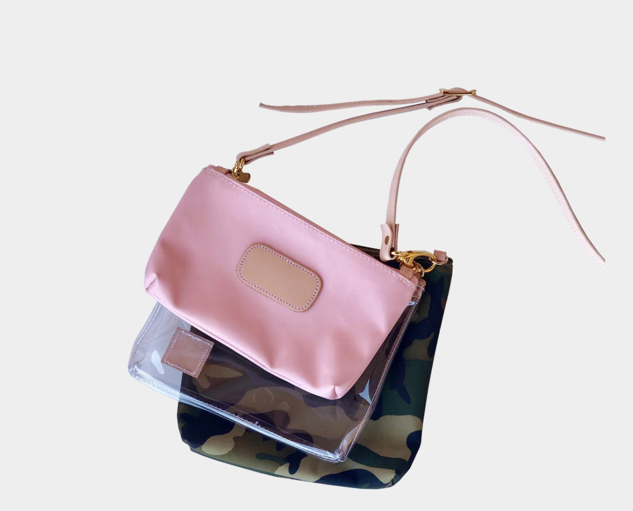You pick the coated canvas colors of the outer bags that surround the middle clear bag. Each bag can be individually & differently monogrammed. A detachable wristlet & an adjustable crossbody strap is included with every Trinity purchase.