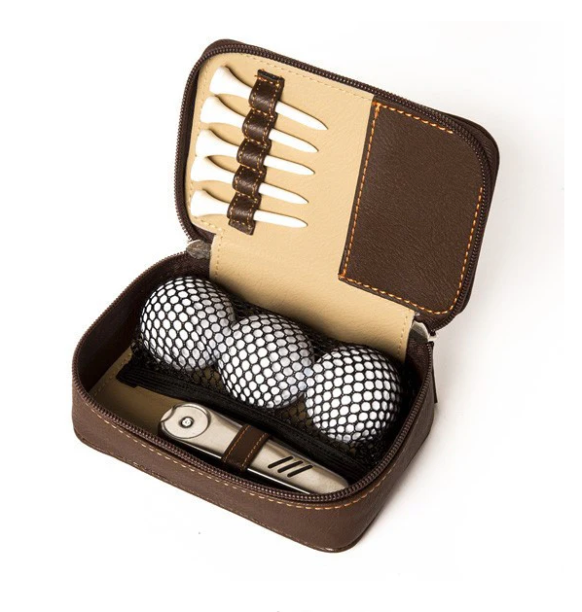 A perfect gift for any golfer or golfing enthusiast! Use it on the course! Set contains 3 golf balls, 5 tees, a divot repair tool, and comes in a sleek genuine leather case.