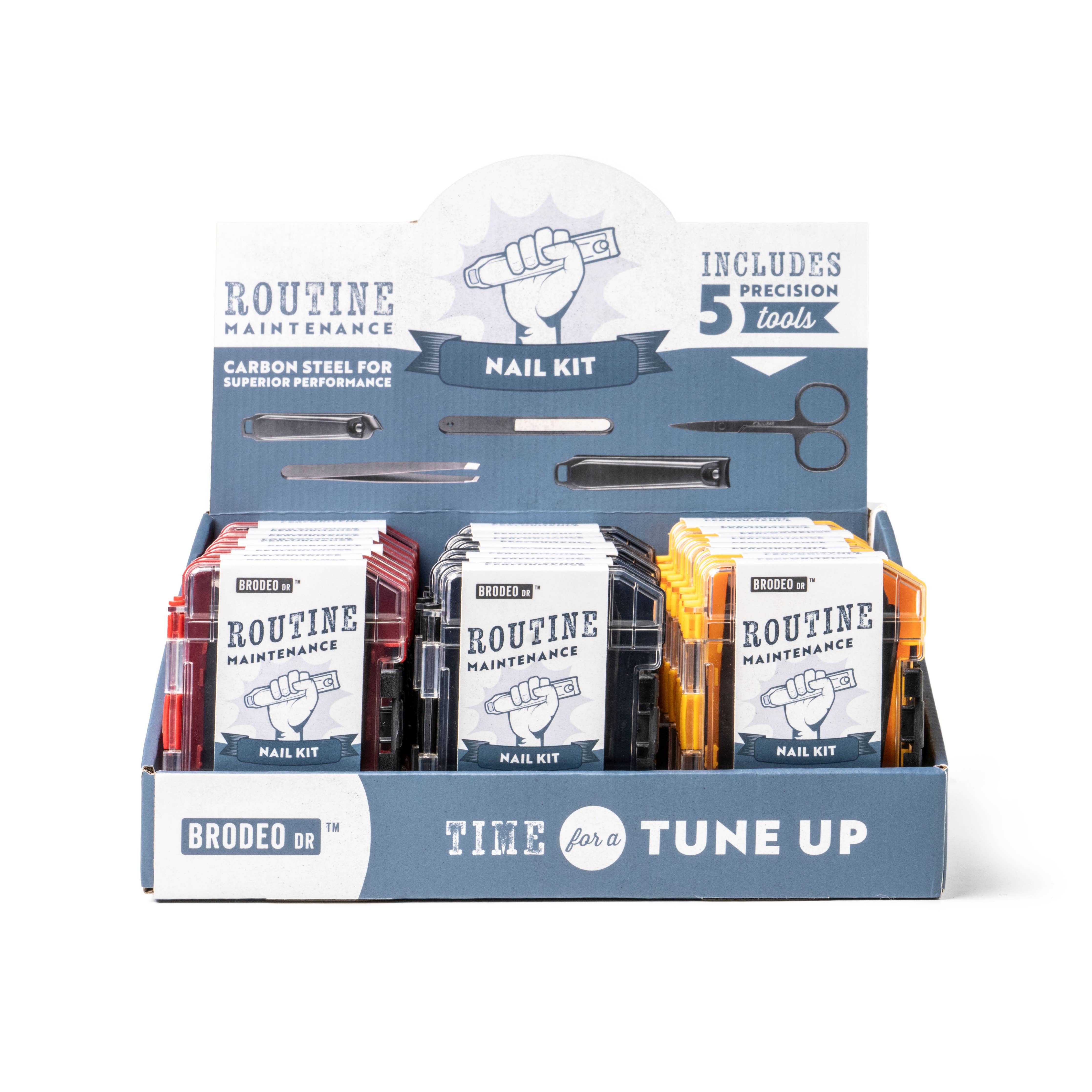 Men’s gifting made easy! Packaged in a mini tool case, this five-piece carbon steel nail kit is the perfect excuse to take time for a tune up. Includes large clipper, angled clipper, scissors, file & tweezers Giftable tool storage case Durable carbon steel Merchandising Details: Giftable tool kit case with wrap band