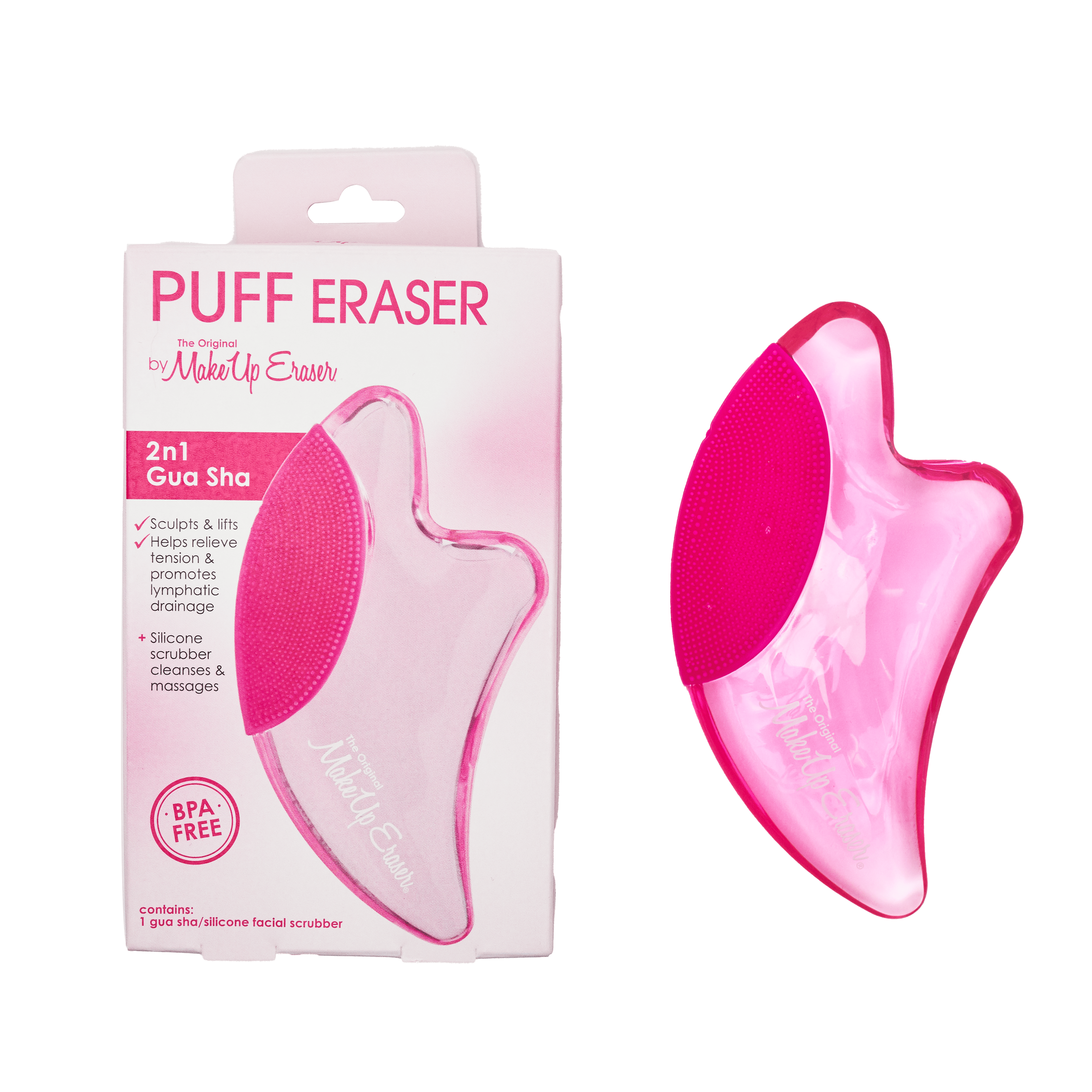 We don't just erase makeup, we also erase puffiness & inflammation! The PUFF Eraser is a 2-n-1 Gua Sha that is dolphin shaped to massage facial muscles to help relieve tension & contour the face. Includes a silicone scrubber with two different bristle textures to help deep clean skin. Durable, easy-to-clean & easy-to-use!
