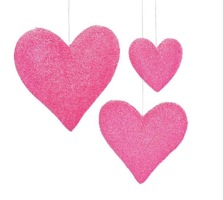 Pink color foam hanging heart assortment. Clear loops for hanging included.
