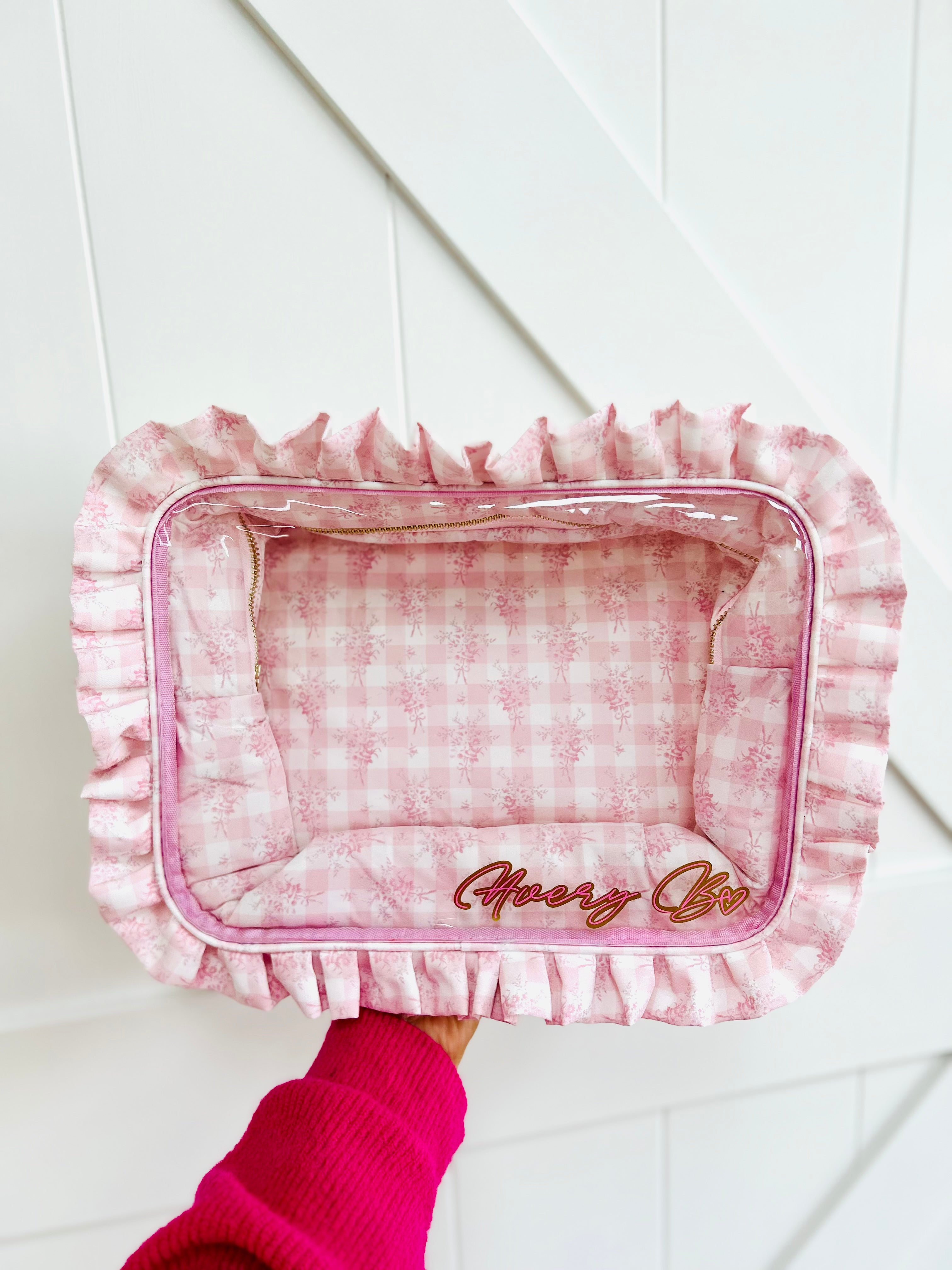 Introducing the Clear Sweet Nylon Cosmetic Bag Collection! Keep your essentials organized in style with this adorable bag featuring floral, ruffles, and a bow all in one place. Effortlessly cute and functional, this bag is sure to make a statement. Could anything be more adorable?