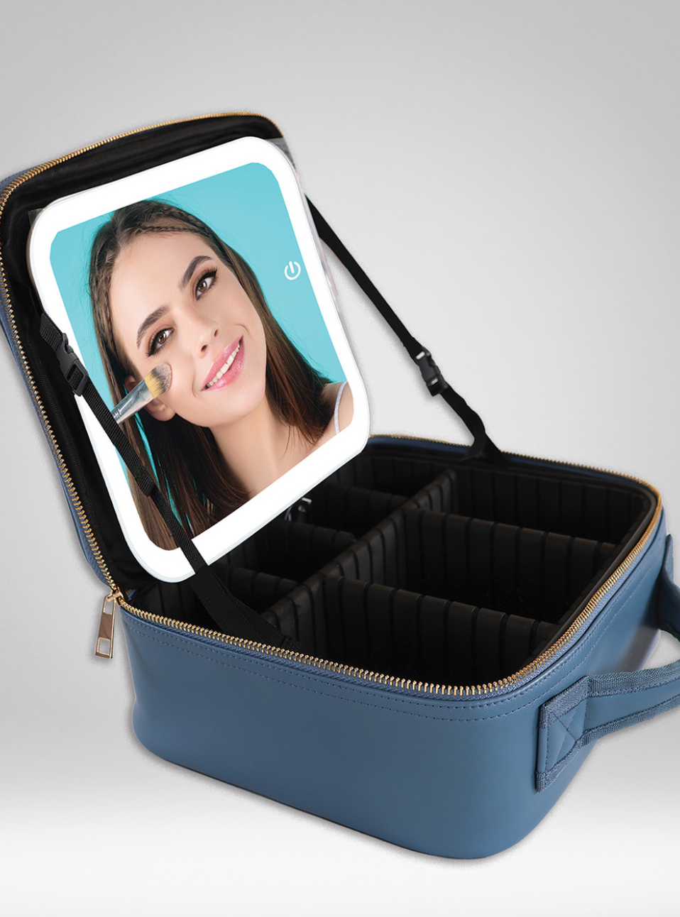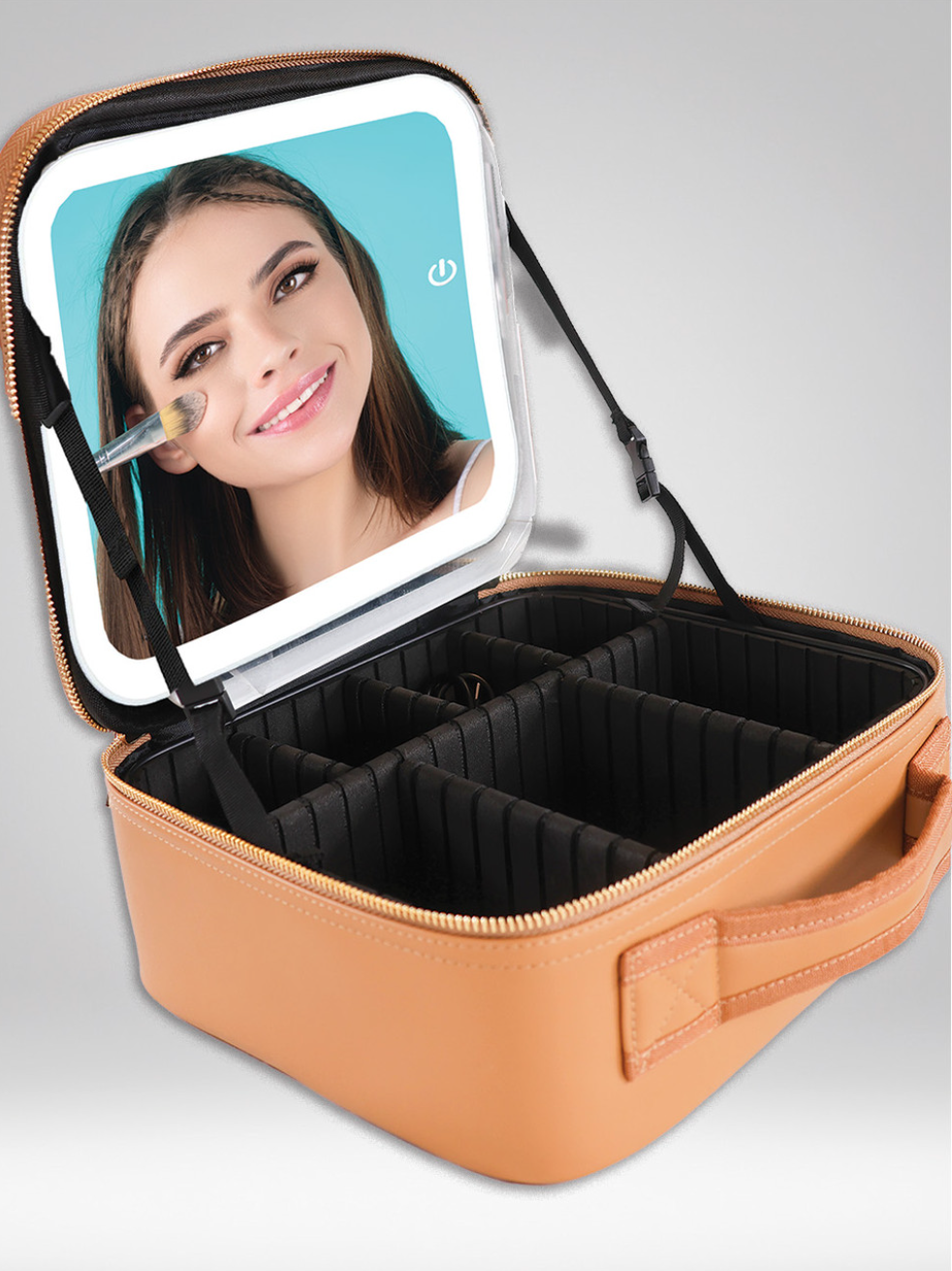 These leather travel cases are perfect to take with you anywhere. Featuring a rechargeable led light up mirror with 3 brightness and warmth settings. Straps to hold the bag open while using the mirror, and adjustable interior compartments lined with foam to keep your things safe. Made of 60% PU 40% polyester leather