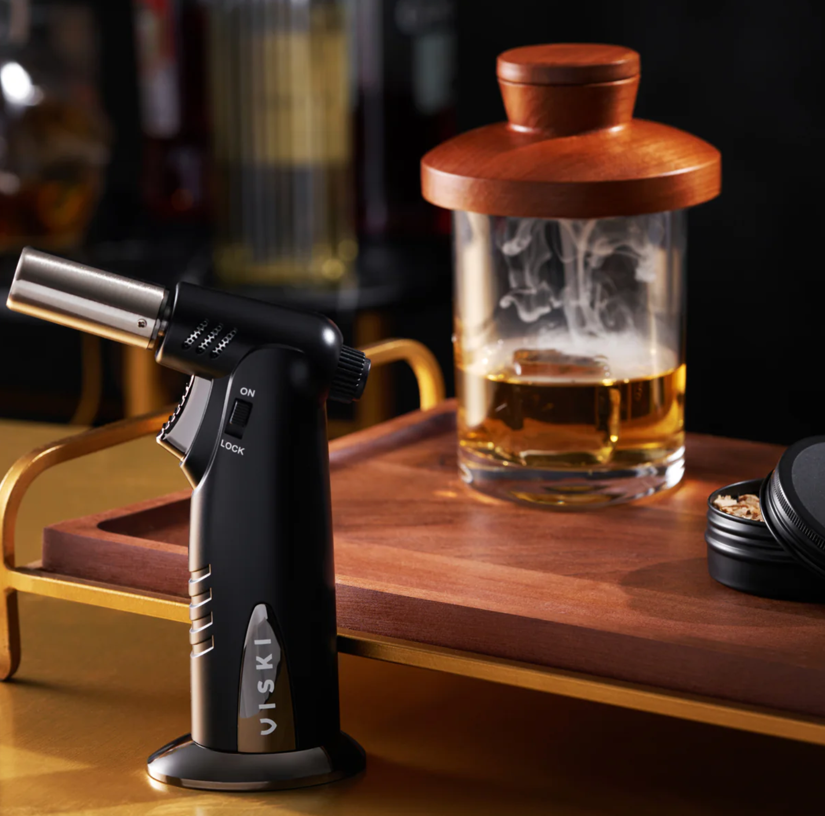 - Includes: 14 oz. lowball glass, Smoker, Fine mesh strainer, Handheld butane torch (fuel NOT included), Tin of oak wood chips