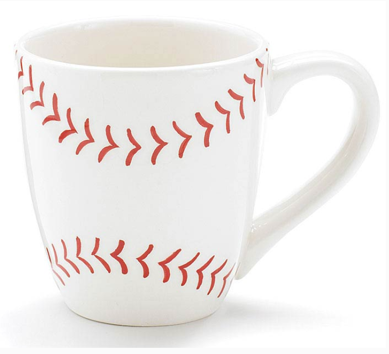 Hand-painted ceramic mug in white white red red stitching to resemble a baseball. White interior and handle. Individually boxed.
