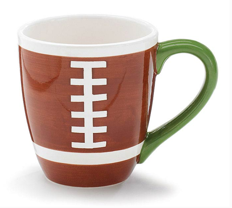 Hand-painted ceramic football mug with brown and white stitching on the front to resemble a football. Interior is white and handle is green. Individually boxed