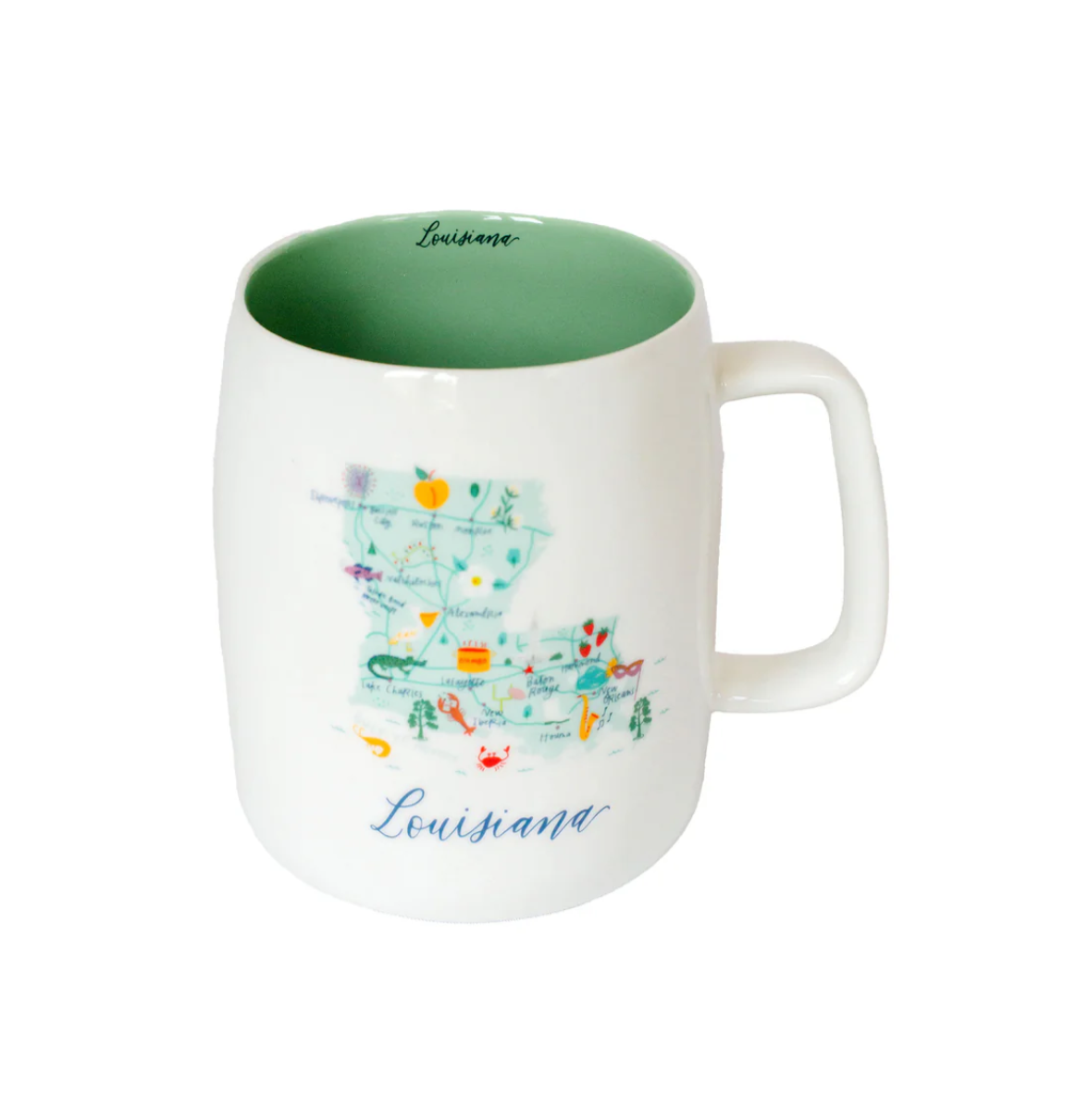 Our Louisiana Coffee Mugs make for the perfect souvenir or gift for a traveling friend. Printed with a bright colored interior. Artwork is done by Caitlin Baumberger of Happy Tines.