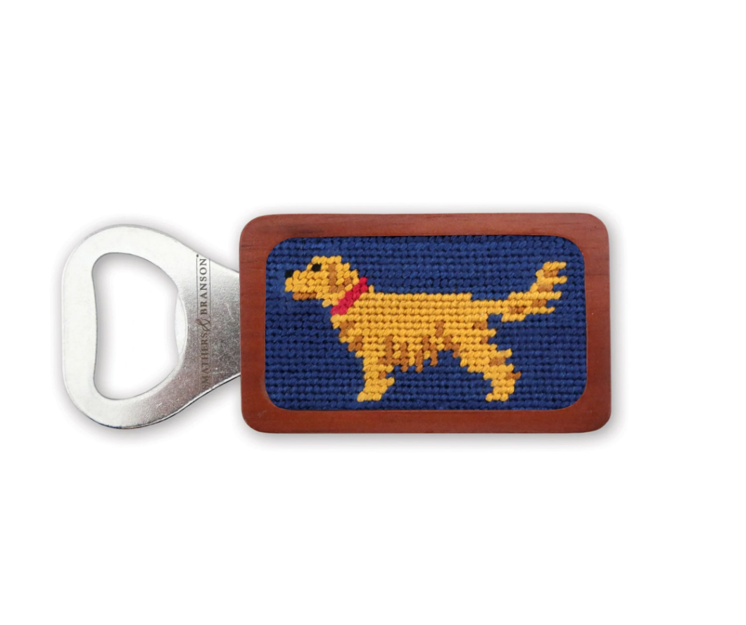 Our 100% hand-stitched bottle openers combine our signature needlepoint with a chestnut colored wooden handle. With a magnet hidden inside the wood, stick our bottle opener on the front of your fridge or show it off on top of your bar!