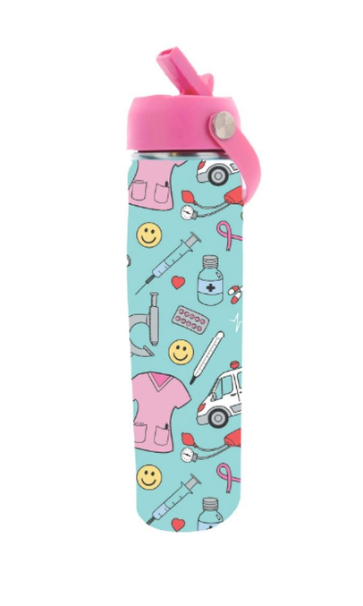 The Nurse Water Bottle is a 24 oz. stainless steel bottle with a straw cap, ideal for any healthcare professional on-the-go.