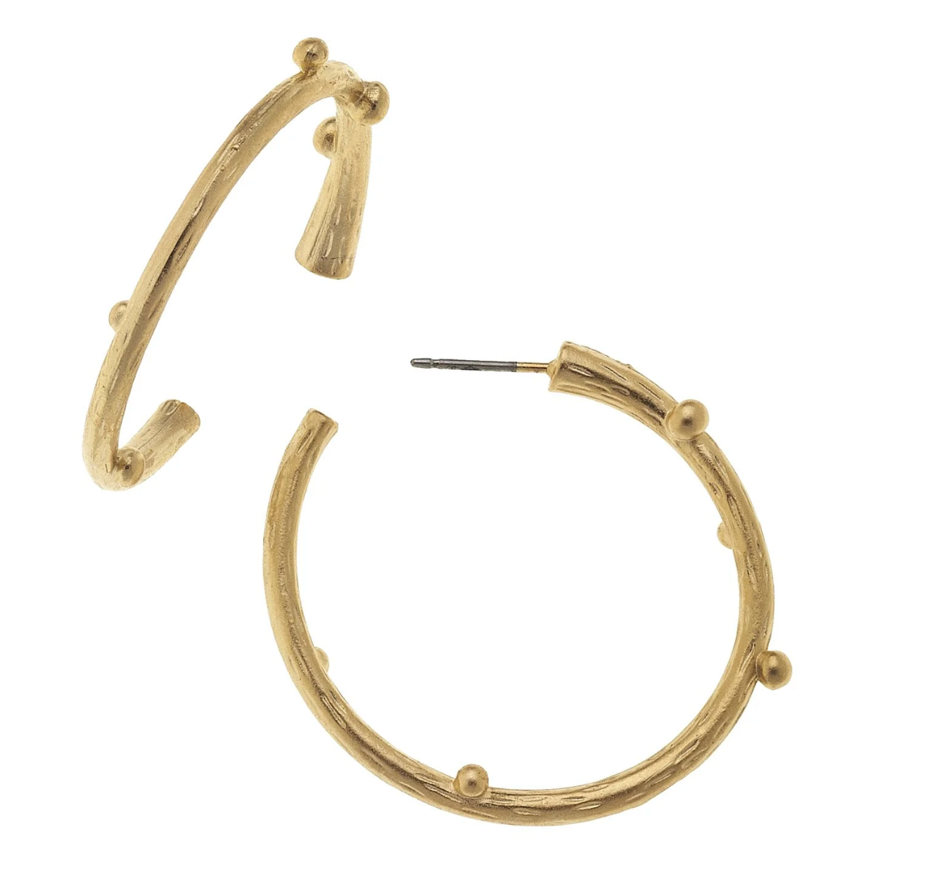 Dainty and feminine, the Vine Hoops make us feel like we should be sipping sweet tea at a garden party. The hand-etched vine texture and bud studs make for a truly charming accessory. Pair these with any look to add a simple and sophisticated sparkle in either 24k gold or Sterling silver