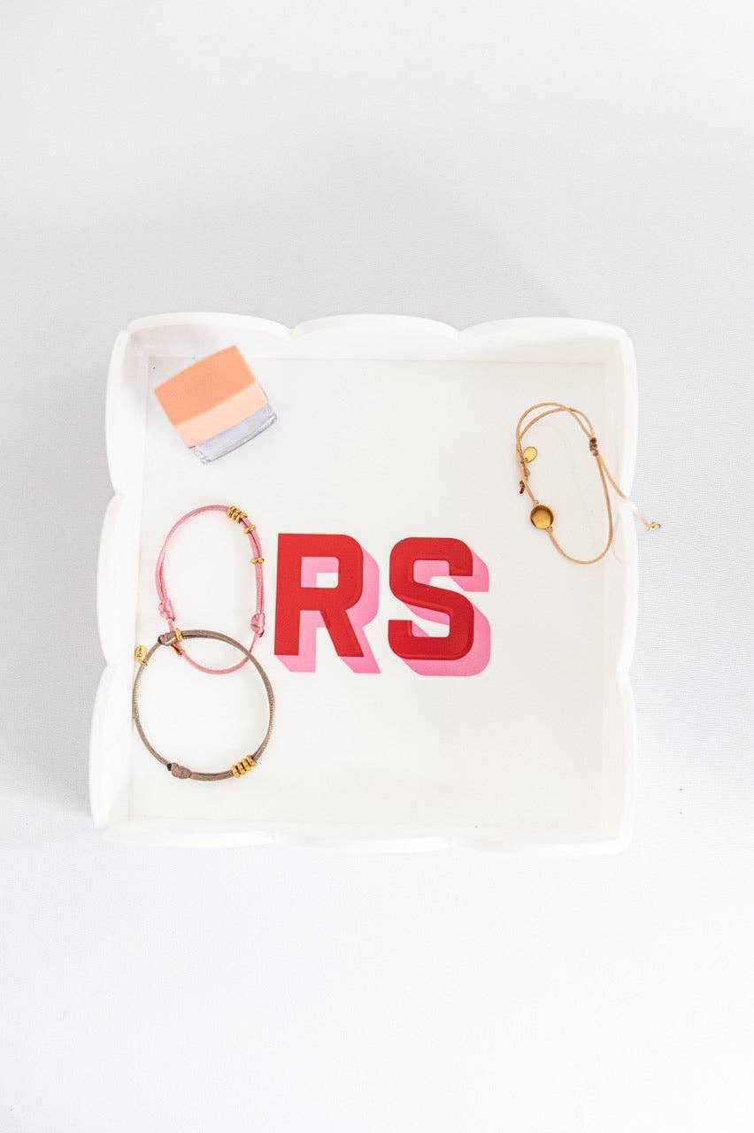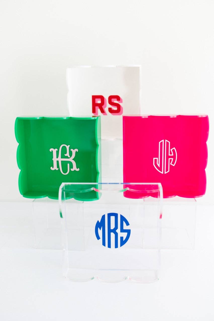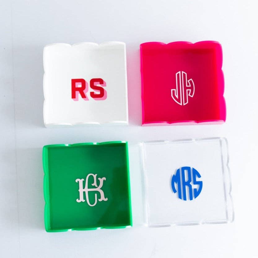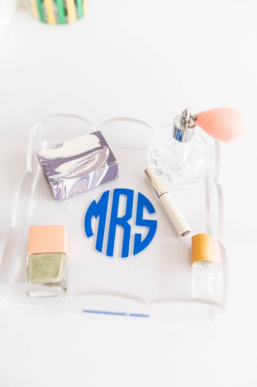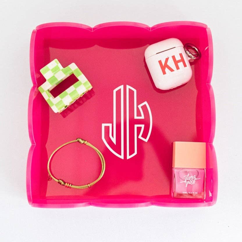 Enhance your space with our Personalized Scalloped Edge Catchall Tray. This custom entryway tray serves as a beautiful monogrammed jewelry dish, perfect for organizing your essentials. Whether used as a personalized serving tray or an office desk storage tray, its elegant design adds a touch of sophistication to any setting. One of our favorite ways to use these acrylic trays are for dorm decor - get the preppy room decor aesthetic style of your dreams with these monogrammed trays!