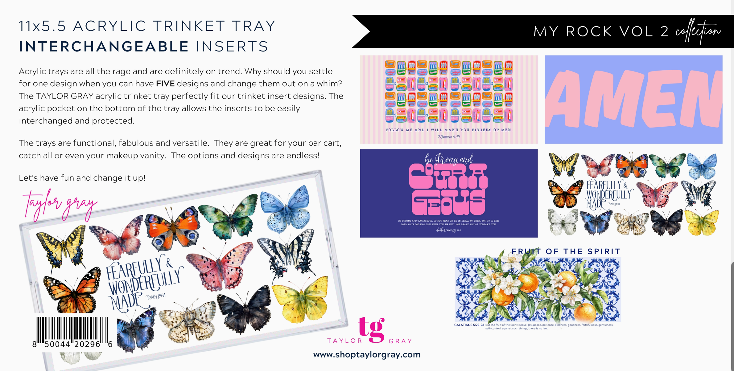 The patent pending pocket on the bottom of the tray allows the inserts to be easily interchanged and protected. Acrylic trays are all the rage and are definitely on trend. Why should you settle for one design when you can have FIVE designs and change them out on a whim? The trays are functional, fabulous and super cute. They are great for your bar cart, makeup counter or even for a catch all. The options and designs are endless!