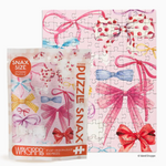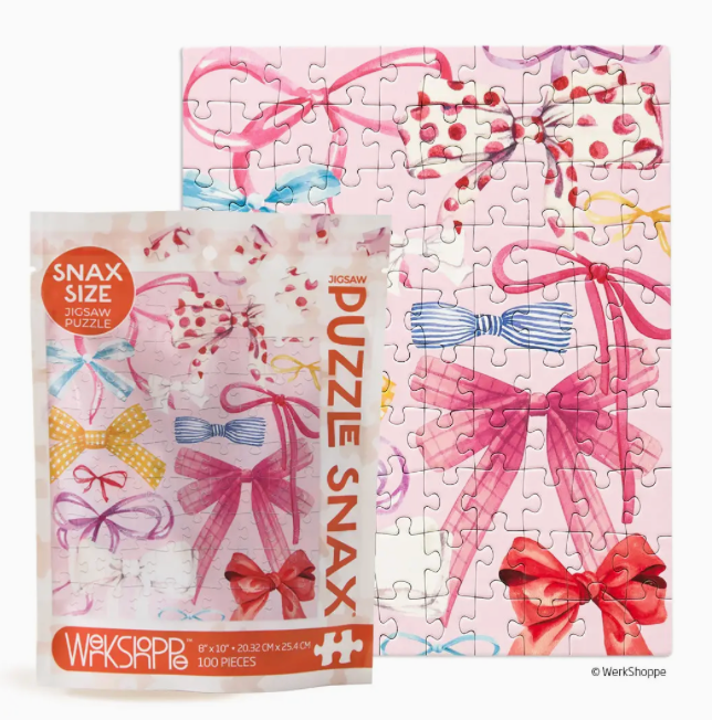 Delight in this 100-piece Puzzle Snax showcasing a charming assortment of vibrant bows. The mix of different sizes, designs and colors of these whimsical accessories conjures up a touch of nostalgia turned modern-day style. Product Information Perfect for on the go, or frame and hang! * 100-piece jigsaw puzzle * Assembled puzzle size: 8” W x 10” H * 100% recycled board & non-toxic vegetable-based ink * Precision cut pieces with minimal puzzle dust * Package: resealable pouch * Recommended age: 7+ years * Art created globally, imported