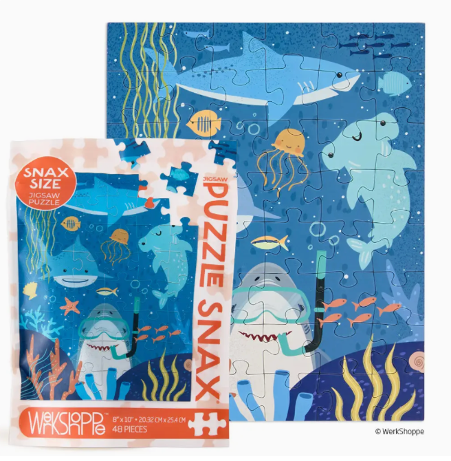A happy school of friendly sharks play around in this 48 piece Puzzle Snax making this a fun activity to enjoy and share. Take a break and pick up some snax, Puzzle Snax. This sustainably made jigsaw puzzle is great for puzzlers of all ages. The art is fantastic and sure to bring a smile to all who engage. A resealable pouch is great for storing the pieces, or frame the completed puzzle in any 8" x 10" frame. Product Information Won "Best Products for Elementary Kids" by Parents’ Picks Awards • 48 piece jigsaw puzzle • Assembled puzzle size: 8" W x 10" H • 100% recycled board & non-toxic vegetable-based ink • Precision cut pieces with minimal puzzle dust • Package: resealable pouch • Recommended age: 5+ years • Art created globally, imported