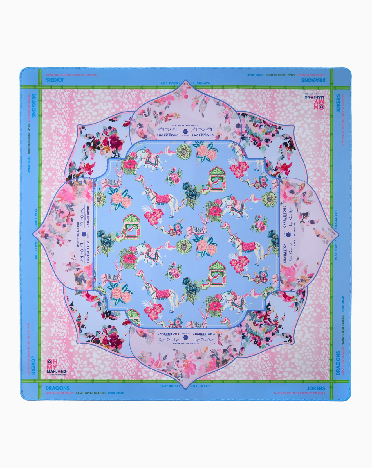 ntroducing the Vivara Mat — a vibrant and whimsical celebration of pattern and play, designed for the Mahjong enthusiast who loves bold beauty with a worldly twist. Featuring a charming mix of elephants, blooming florals, and painterly antelope print in shades of soft pinks and layered blues, this mat brings an elevated sense of joy and wanderlust to your game night aesthetic. It’s artful yet playful — a visual escape that feels part garden fête, part global adventure.