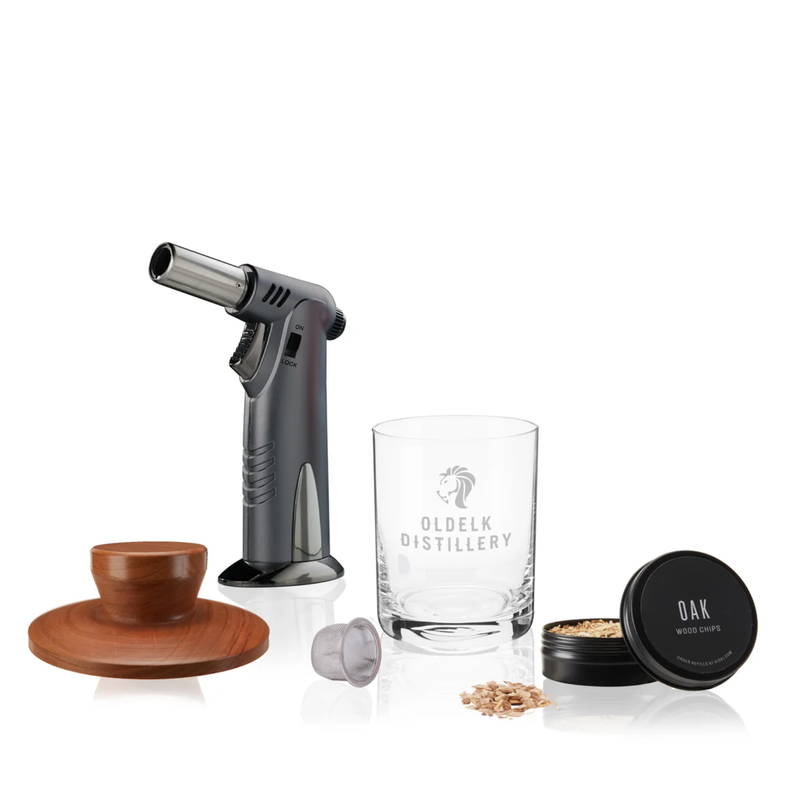 - Includes: 14 oz. lowball glass, Smoker, Fine mesh strainer, Handheld butane torch (fuel NOT included), Tin of oak wood chips