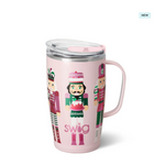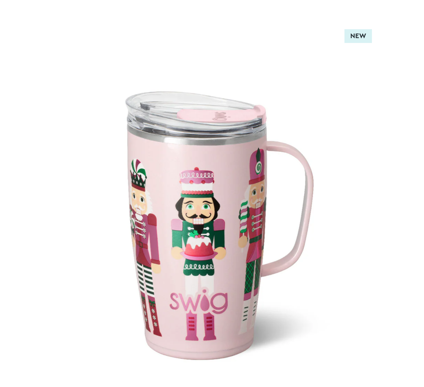 Take a "swig" of whatever fuels your day!Β βπ Metallic toy soldiers dressed with peppermints and holiday candy march around a pale pink glitter background.