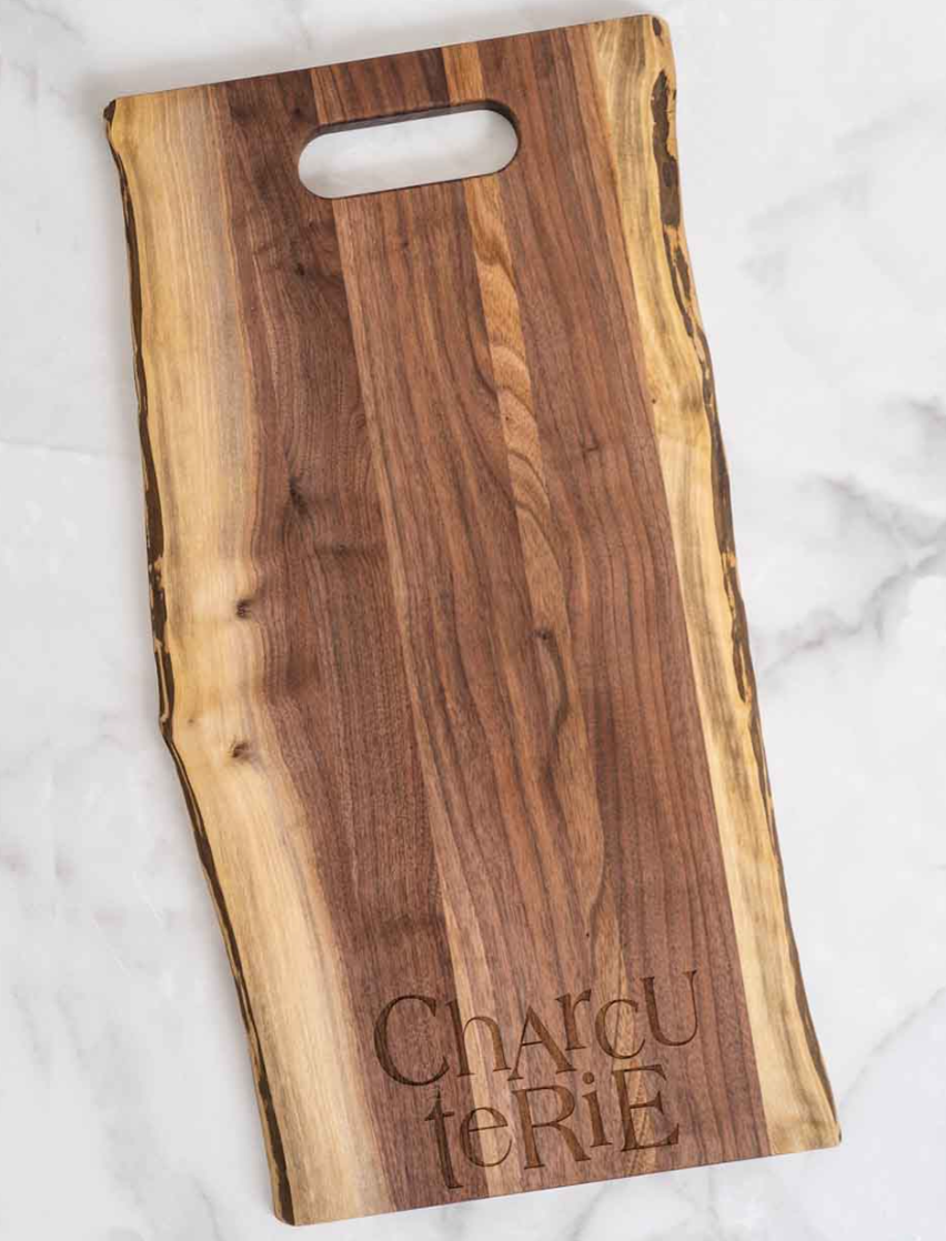Crafted of premium walnut wood, this gorgeous charcuterie + cutting board features a live edge and is a workhorse that can be used for preparing food or as an impressive serving board or tray for cheese & charcuterie. This naturally self-healing and mark-resistant board is hand finished with durable cutting board mineral oil to both protect the wood and bring out its natural grain. Will last a lifetime