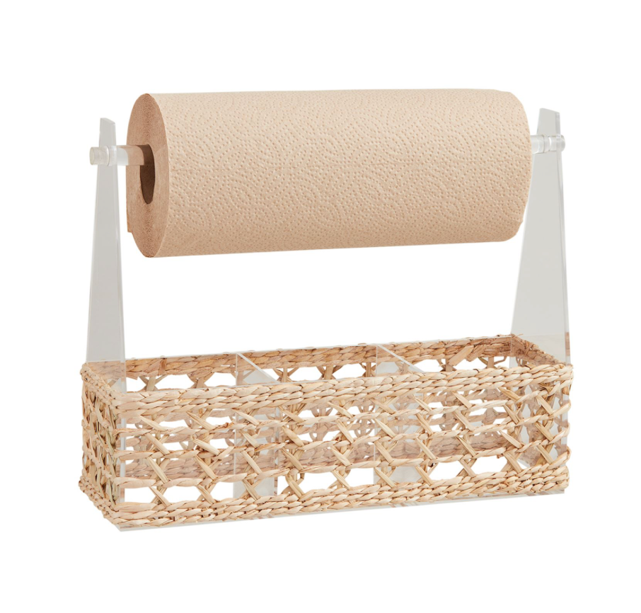 Three-sectioned acrylic utensil caddy with woven seagrass exterior sleeve and paper towel dowel.