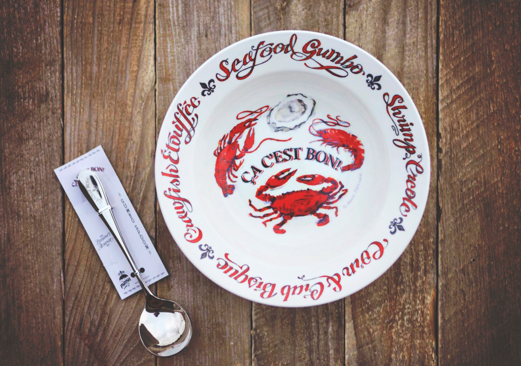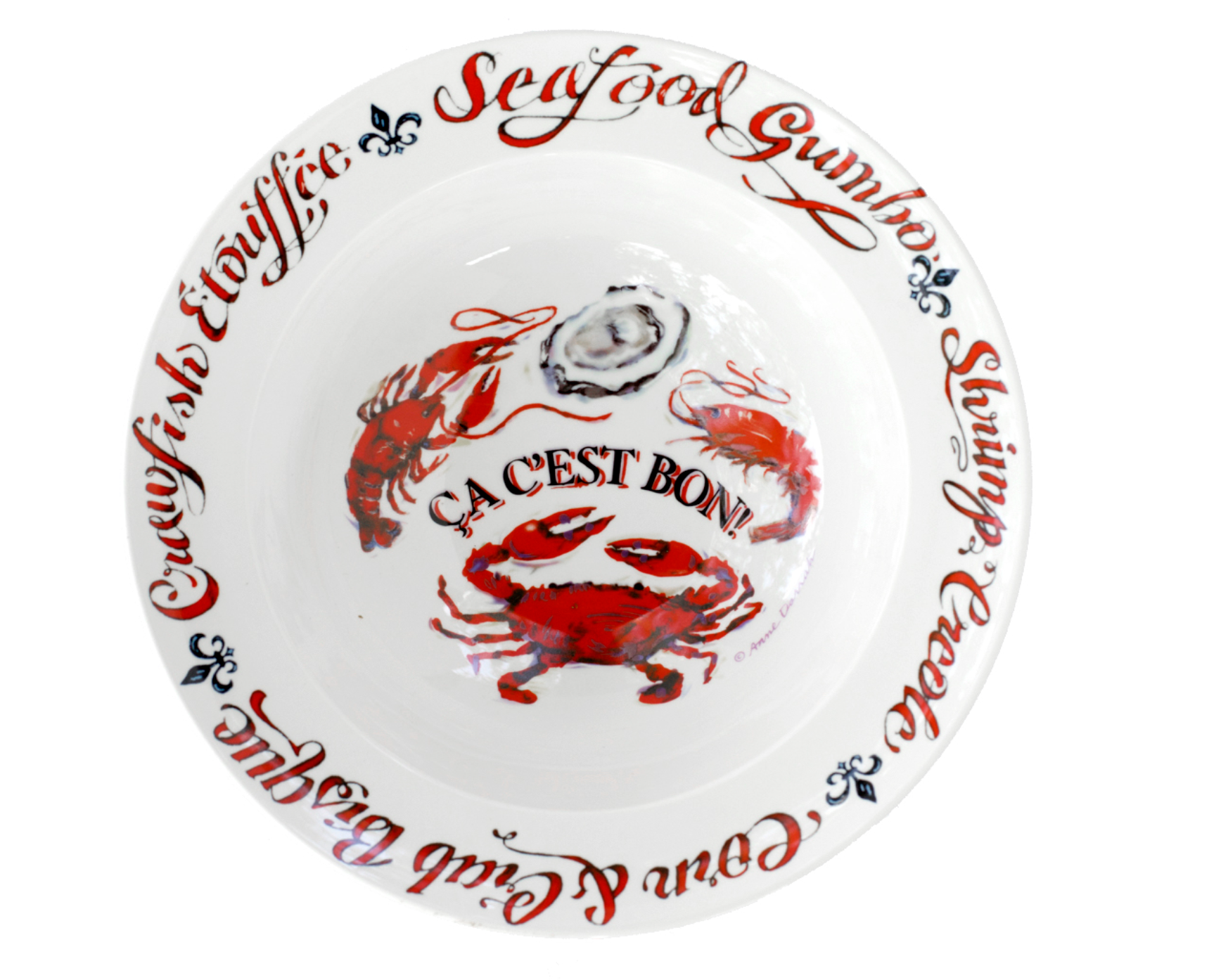 This ceramic gumbo bowl features our “Ca C’est Bon” design. it includes images of a fleur de lis, shrimp, oyster, crab and crawfish along with the words “Seafood Gumbo”, “Shrimp Creole”, “Crawfish Etouffee” and “Corn Crab Bisque” in red and black printed on white.