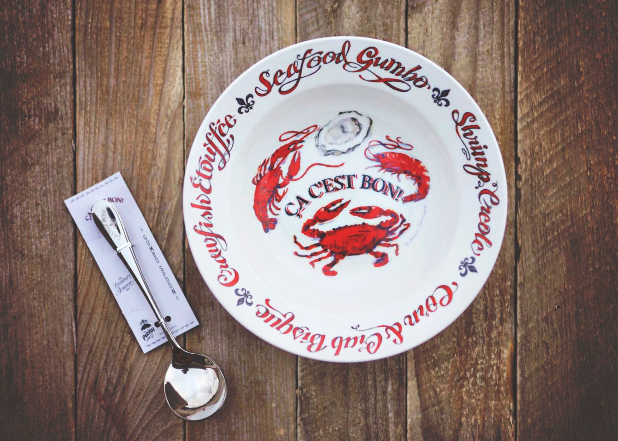 These spoons are perfect for eating gumbo. The handle features the words “Ca C’est Bon” along with a fleur de lis.