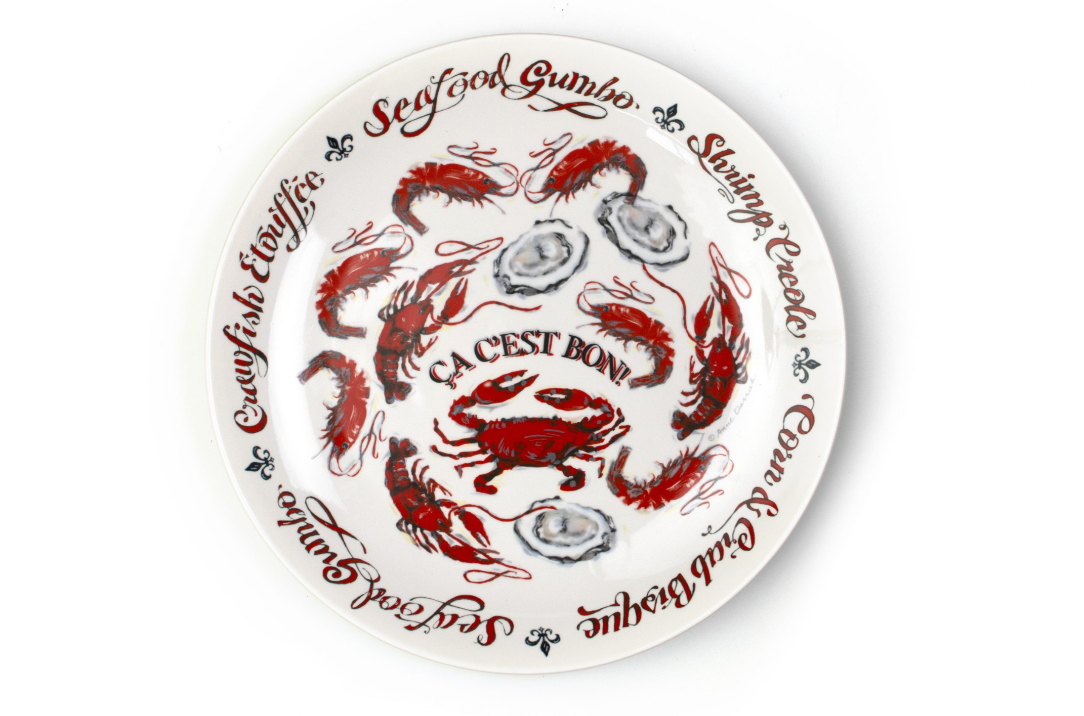 This ceramic platter features our “Ca C’est Bon” design. it includes images of a fleur de lis, shrimp, oyster, crab and crawfish along with the words “Seafood Gumbo”, “Shrimp Creole”, “Crawfish Etouffee” and “Corn Crab Bisque” in red and black printed on white.