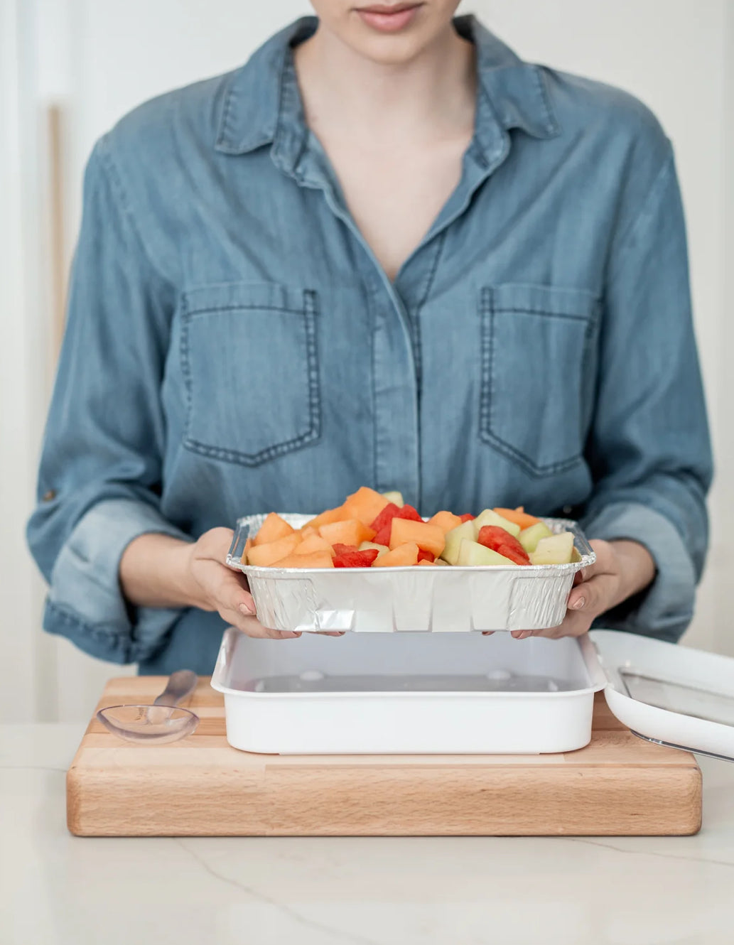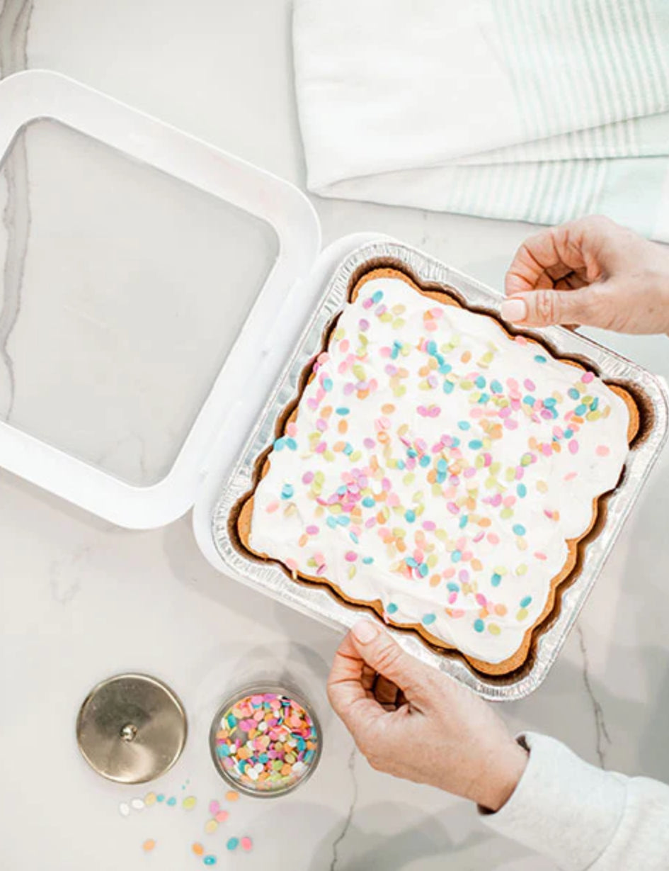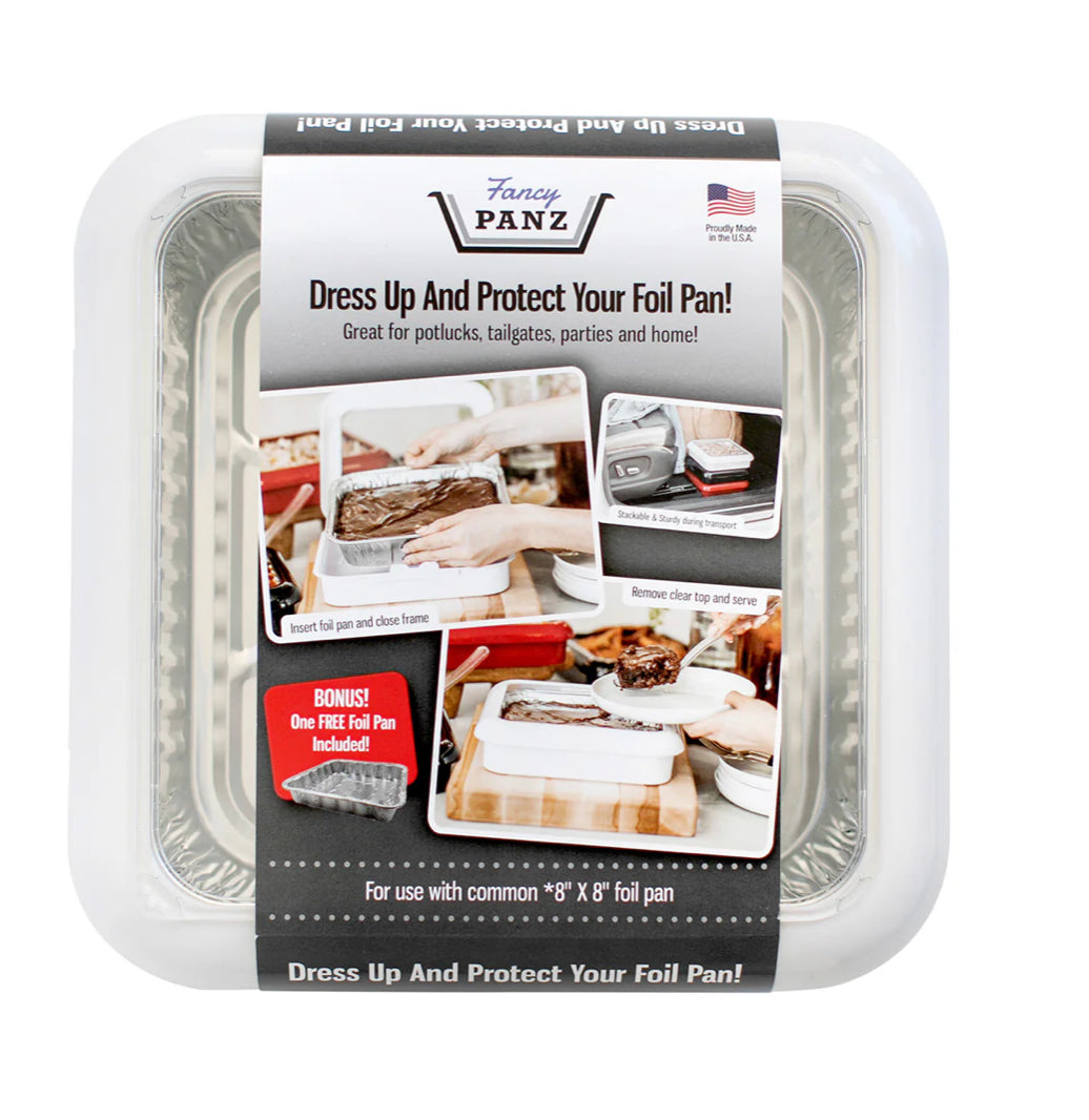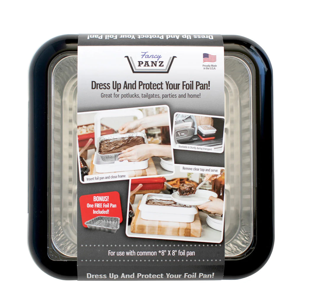 Fancy Panz 8x8 brings elegance and convenience to your favorite 8x8 foil pans, commonly known as a brownie pan. Simply place the pan in your Fancy Panz, remove the clear window, and you’re ready to serve. When the event wraps up, just lift out the foil pan, leaving your Fancy Panz clean and ready for the next use. No messy dishes to scrub and no more flimsy foil pans to transport.