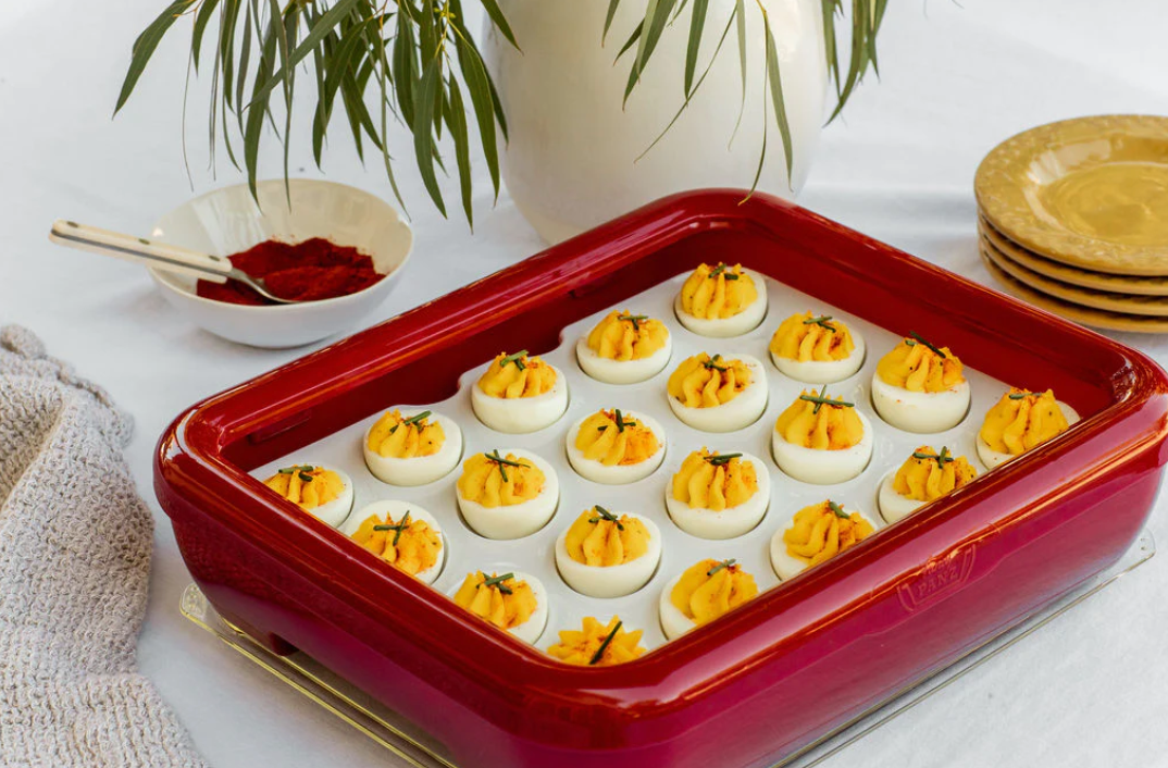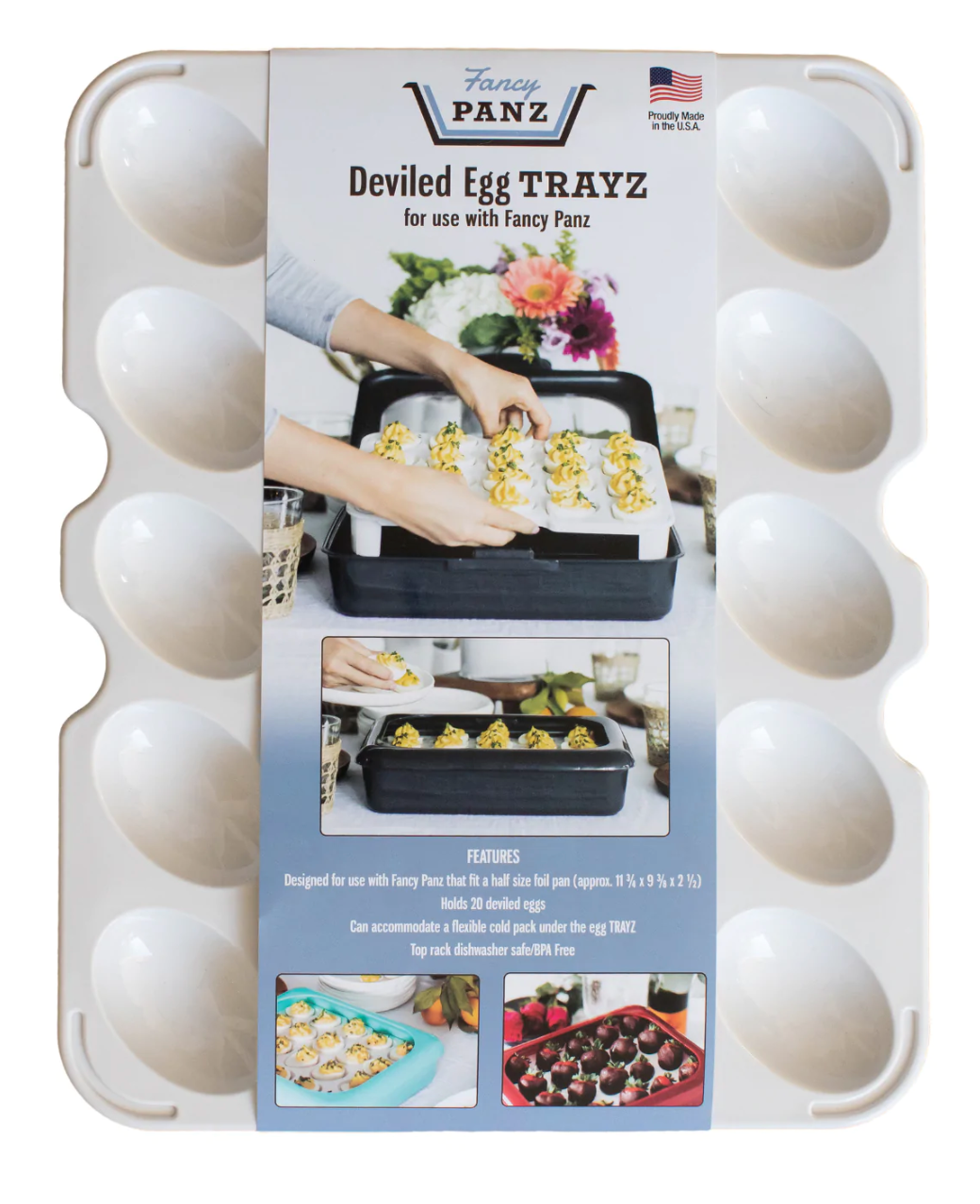 - WHAT IS A DEVILED EGG TRAYZ: For use with a Fancy Panz, our Deviled Egg Trayz insert is a convenient & practical way to transport and serve your deviled eggs, chocolate covered strawberries or stuffed mushrooms.