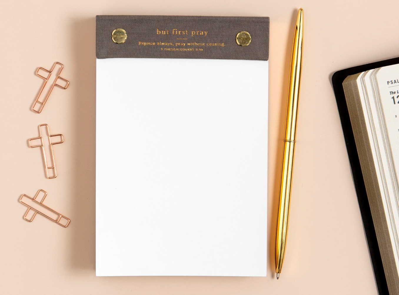 Introducing our But First Pray Desktop Notepad, beautifully adorned with gold accents. This elegant notepad is perfect for jotting down notes, reminders, or inspiring thoughts throughout your day. Its charming design features a verse from 1 Thessalonians 5:16 . Our But First Pray Desktop Notepad serves as a daily reminder to prioritize prayer within our daily walk, making it a delightful addition to any workspace. Whether for personal use or as a thoughtful gift, this notepad will inspire and uplift!