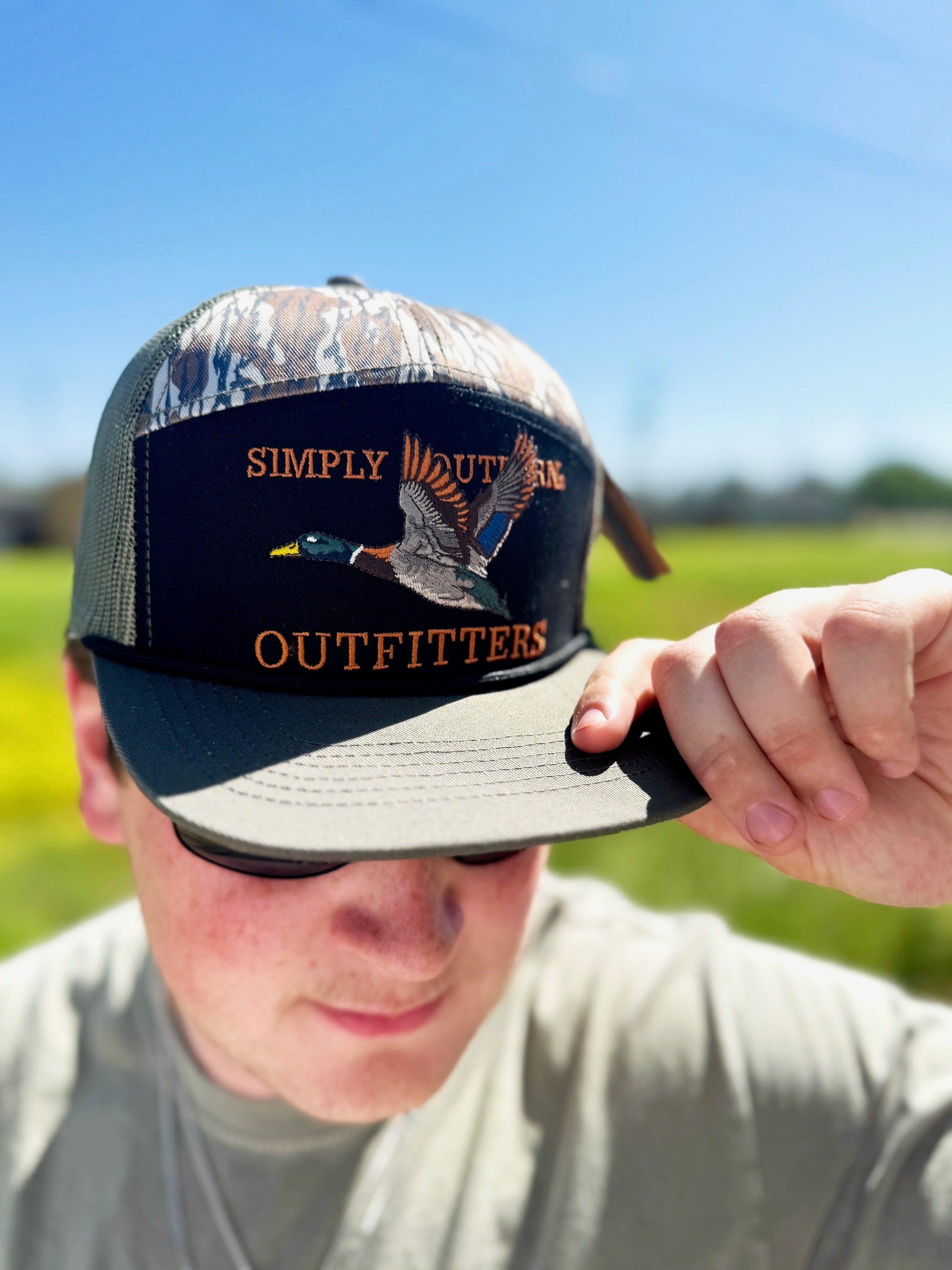 Our men's hats are a mix of trucker-style and structured caps, featuring various embroidered designs. They come in different colors, including neutral tones like tan, brown, and navy, as well as camo patterns and two-tone combinations. The front panels display a variety of embroidered graphics, such as wildlife, patriotic symbols, and humorous phrases.