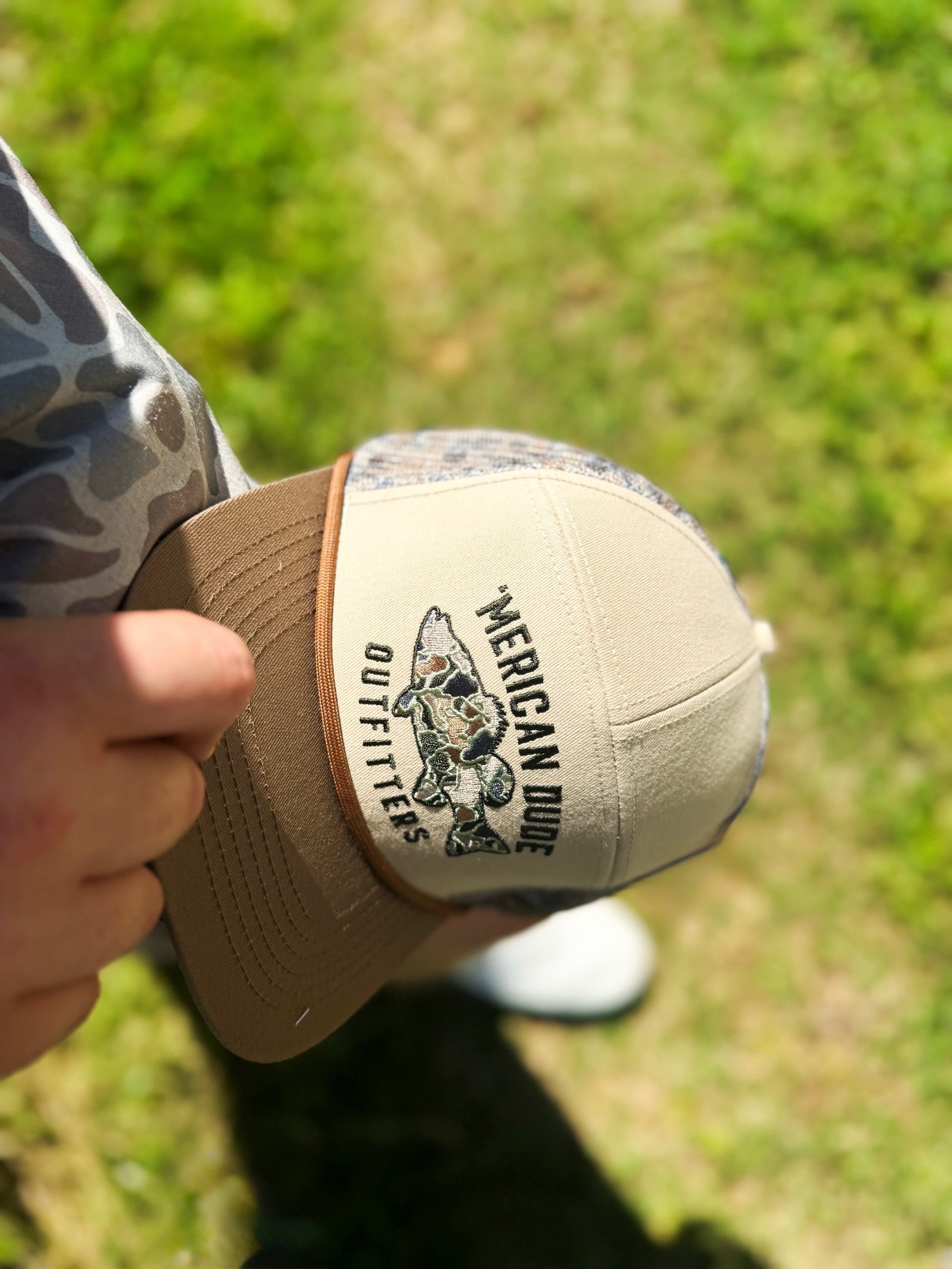 Our men's hats are a mix of trucker-style and structured caps, featuring various embroidered designs. They come in different colors, including neutral tones like tan, brown, and navy, as well as camo patterns and two-tone combinations. The front panels display a variety of embroidered graphics, such as wildlife, patriotic symbols, and humorous phrases.