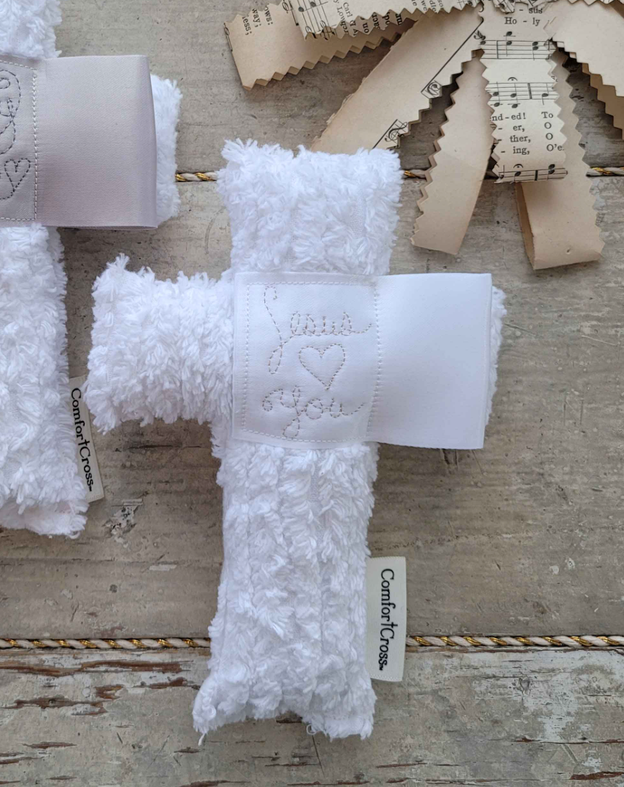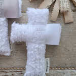 Handcrafted primarily from new materials, these one-of-a-kind crosses are lovingly made and artistically embellished to bring joy to babies in the Lord. Each soft and cuddly cross is a wonderful tool to introduce and guide little ones in sharing their prayers, fears, desires, and praises with Christ. No two crosses are exactly alike.