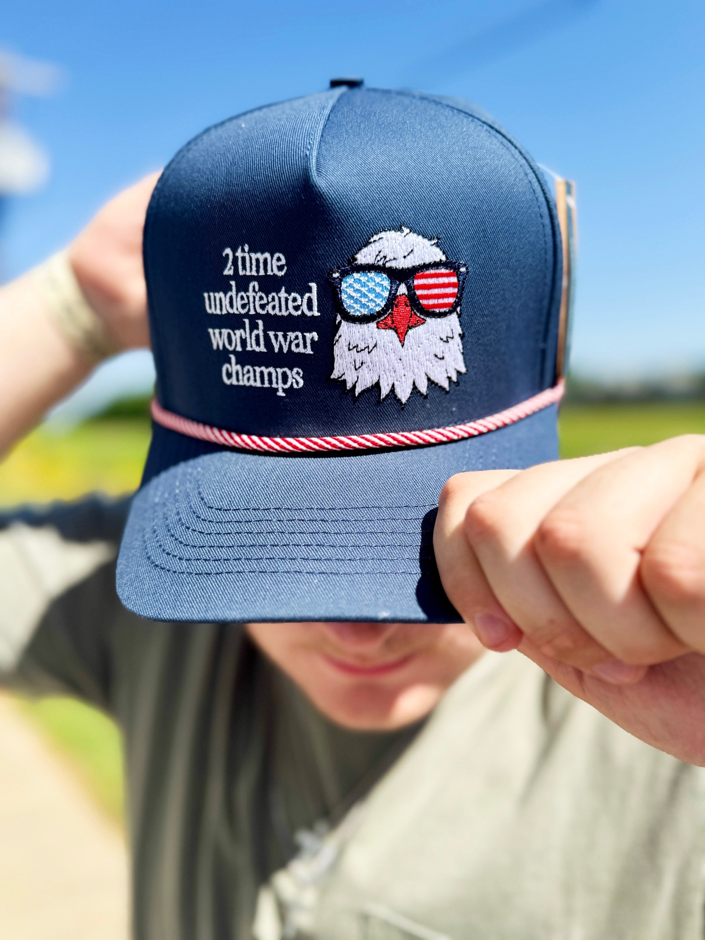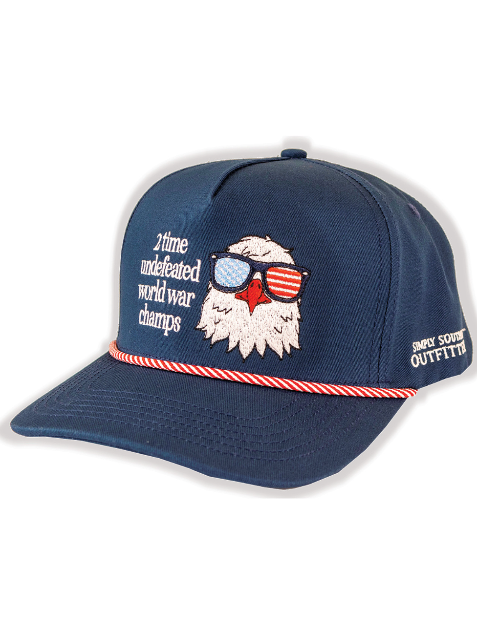 Our men's hats are a mix of trucker-style and structured caps, featuring various embroidered designs. They come in different colors, including neutral tones like tan, brown, and navy, as well as camo patterns and two-tone combinations. The front panels display a variety of embroidered graphics, such as wildlife, patriotic symbols, and humorous phrases.