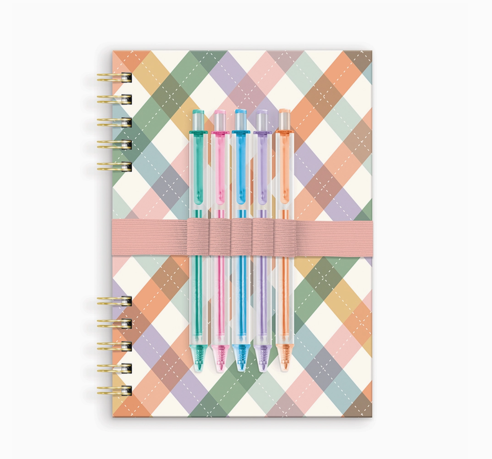 Never lose another pen again! This 192-page hardcover notebook with 100 gsm paper features convenient elastic loops on the cover that come stocked with five multicolored pens—use as is or swap 'em out with your personal faves. Whether you're taking notes in class or mapping out your next big adventure, this journal keeps your writing tools right where you need them! • Comes with five gel pens and a removable, reusable elastic pen holder that fits them all so you can write anywhere—at home or on the go • Allows for mixing and matching of ink colors to fit your mood or task • Features a unique and stylish split spiral, allowing the notebook to lie flat and making writing easy Hardcover 192 lined pages Split wire-o binding 5 colored ink pens 5.74""w x 8.14""h 100 gsm paper