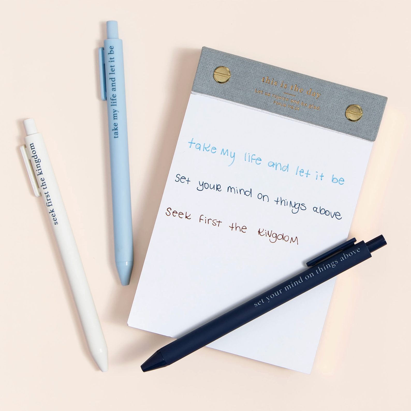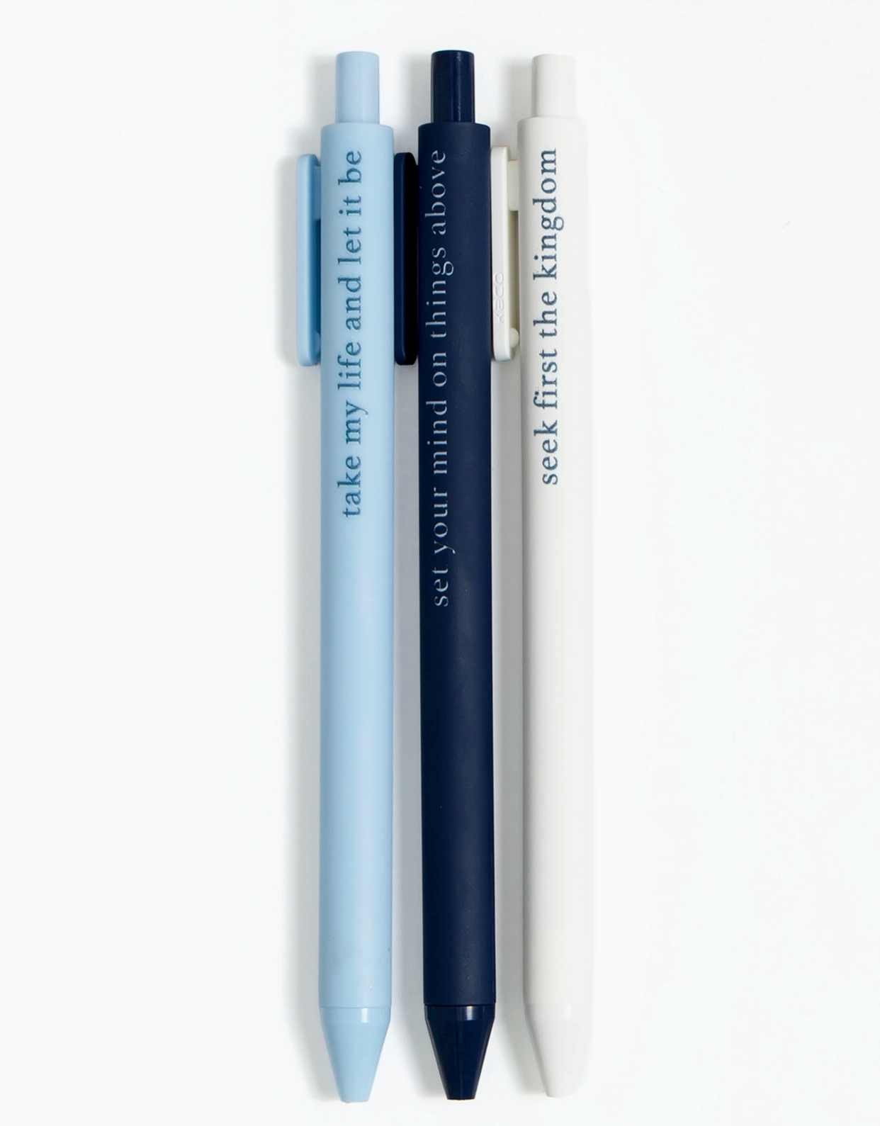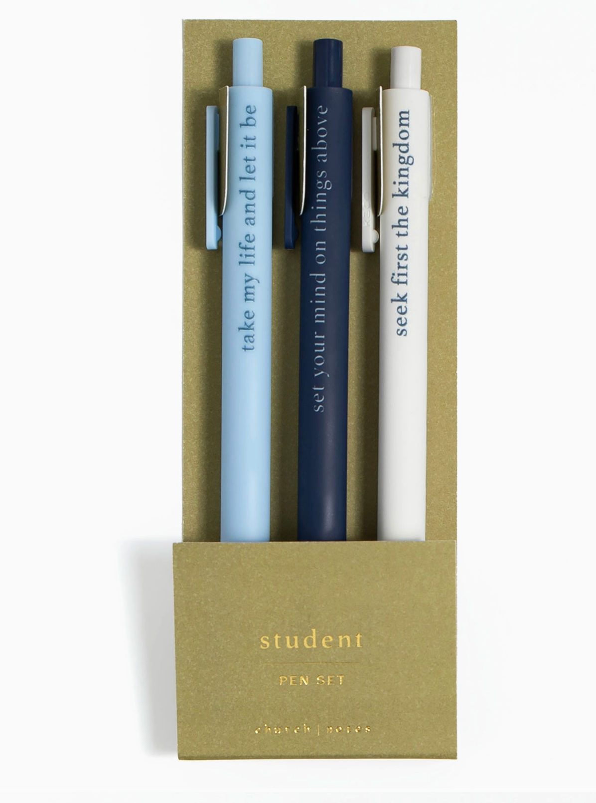 Perfect for Bible study, journaling, or quiet time notes, the Student Pen Set is both purposeful and inspiring. Each smooth-writing pen features a Scripture-based phrase to keep your heart centered on truth—“take my life and let it be,” “set your mind on things above,” and “seek first the kingdom.” Whether you’re a student of Scripture or gifting to one, these pens make a thoughtful addition to any faith-filled stationery collection. Ideal for teens, college students, or anyone deepening their walk with God. Pair them with a Bible journal, planner, or devotional for a meaningful gift set. Ink colors: Light Blue, Navy, White Size: Packaging - 6"×2.25×0.4" Design: Take my life and let it be; Set your mind on things above; Seek first the kingdom