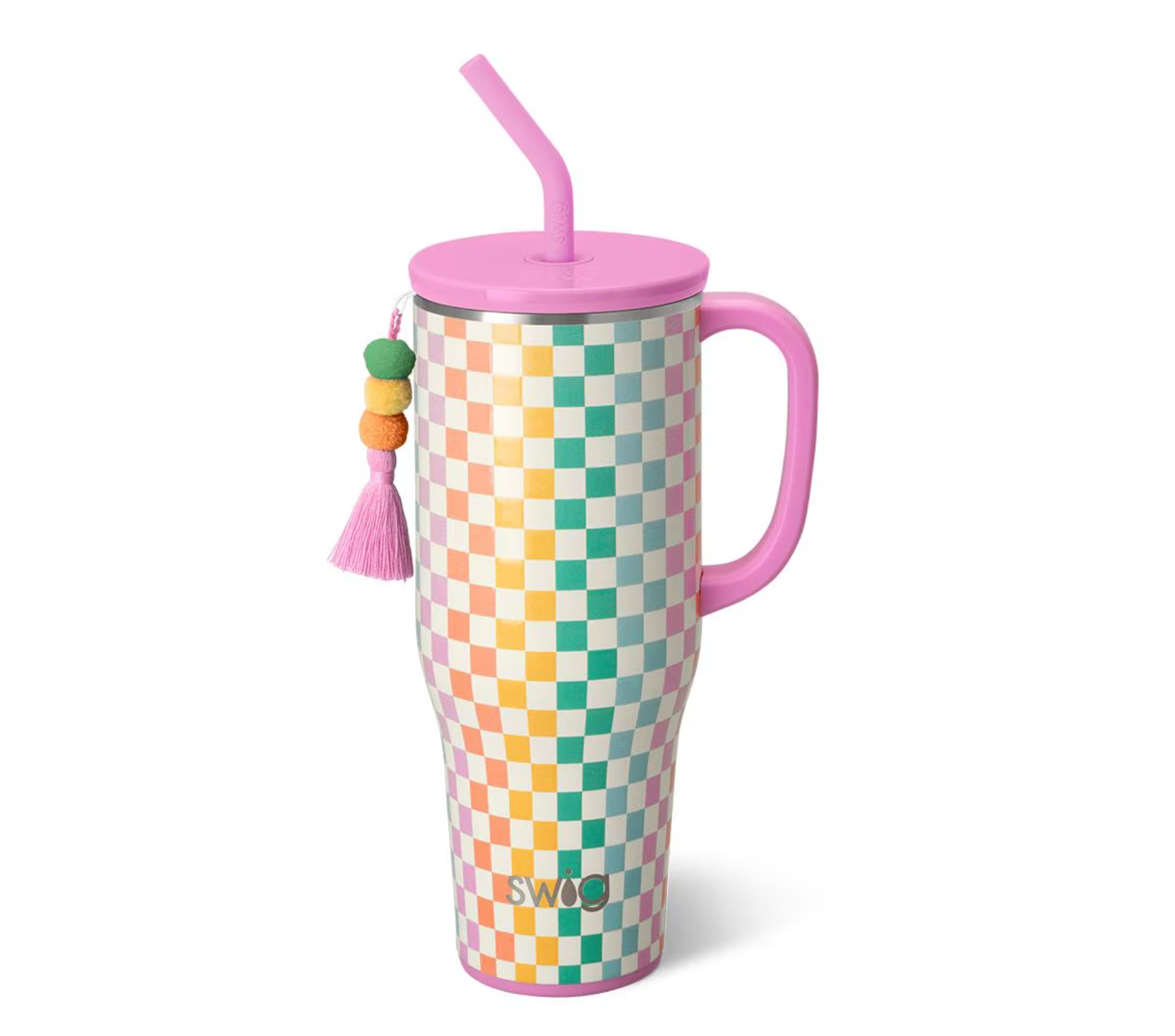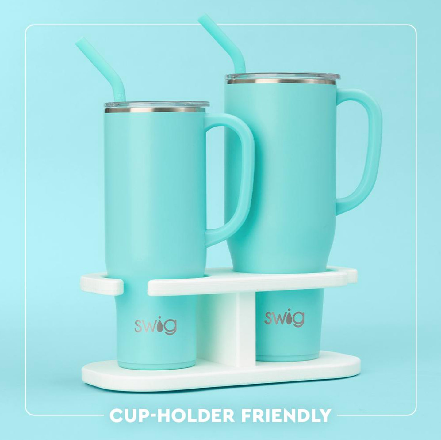 Hydrating has never been easier with our 40oz Insulated Mega Mug! A cup holder-friendly frame, a comfort-grip handle, and a plastic straw with a silicone flexi-tip all come together to create your new favorite Swig.