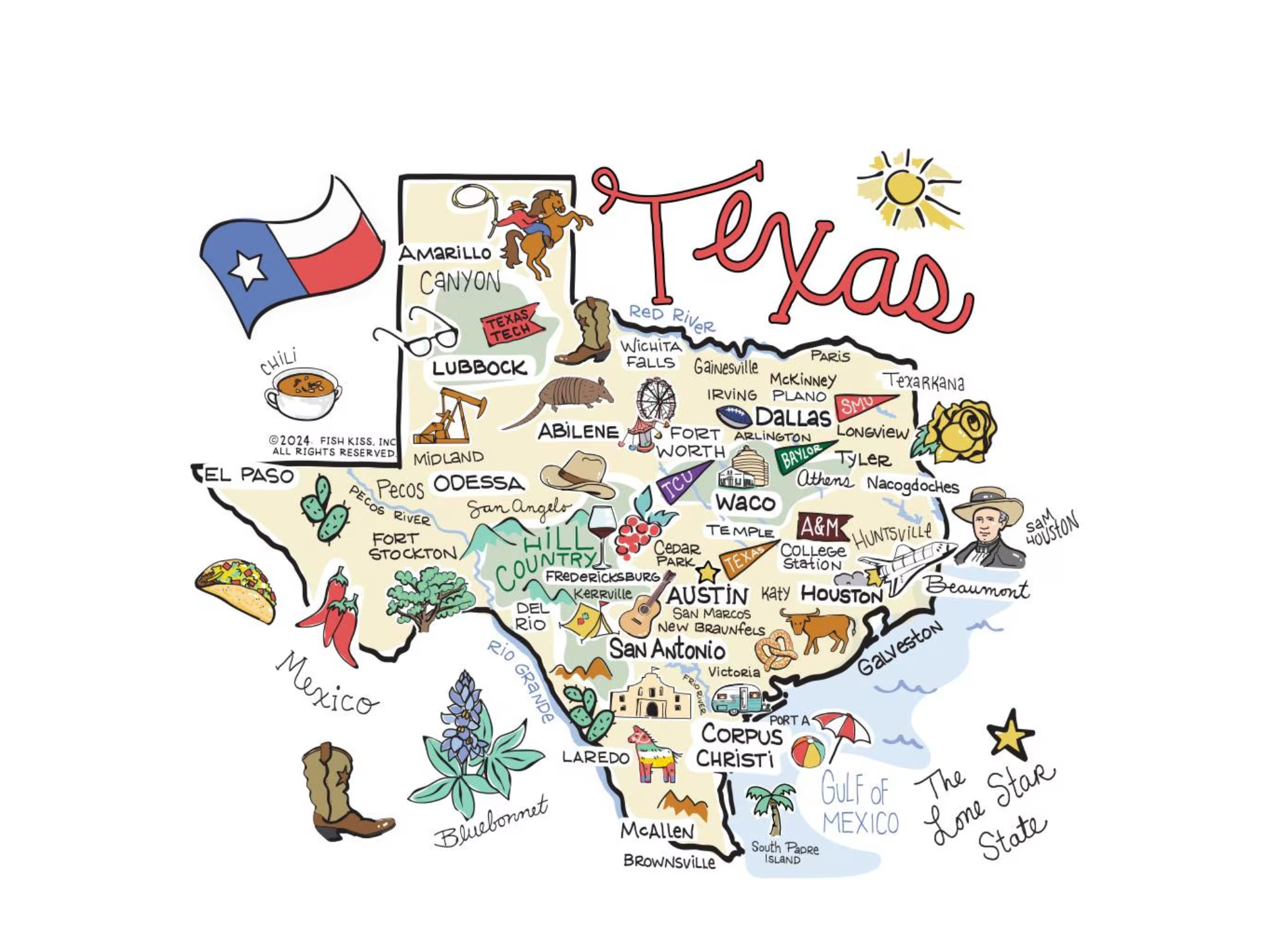Mega sips, mega chill! 🧊 Bring the comfort of home with you everywhere. These one-of-a-kind designs by Fish-Kiss display what makes Texas special. Look closely - you might even find your small town!