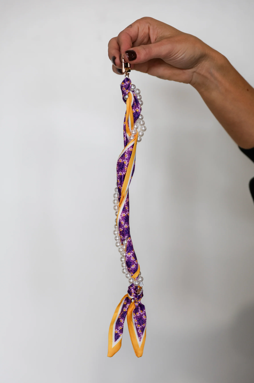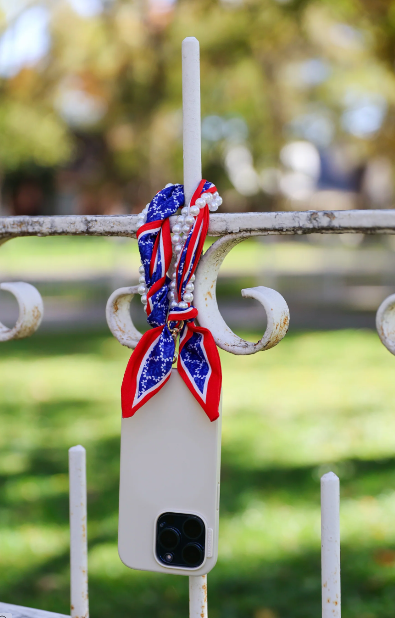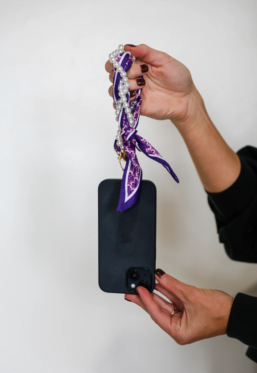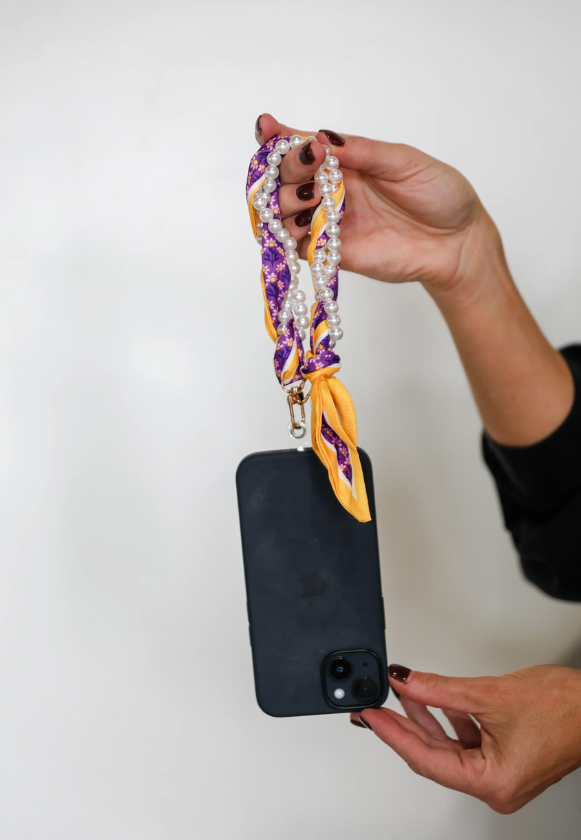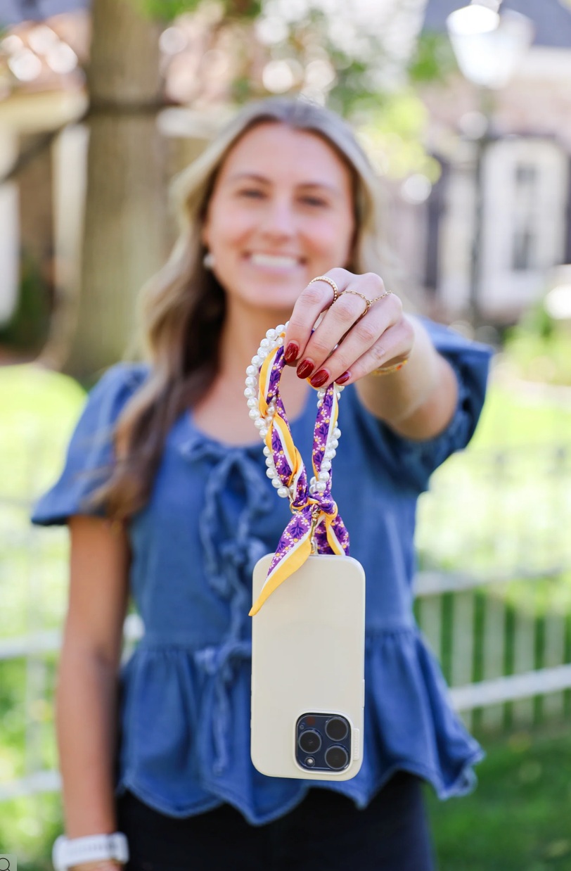 Pretty, pearly, and perfect for keeping your phone close—this wristlet is your new must-have. Wrapped in a floral scarf and stacked with faux pearls, it’s giving sweet meets spirited. It clips right onto your phone using the included clear tether (just tuck it into your case and go!). Whether you're cheering from the sidelines, running to class, or grabbing coffee with friends, this little strap is the cutest way to stay hands-free. Key