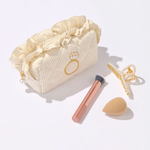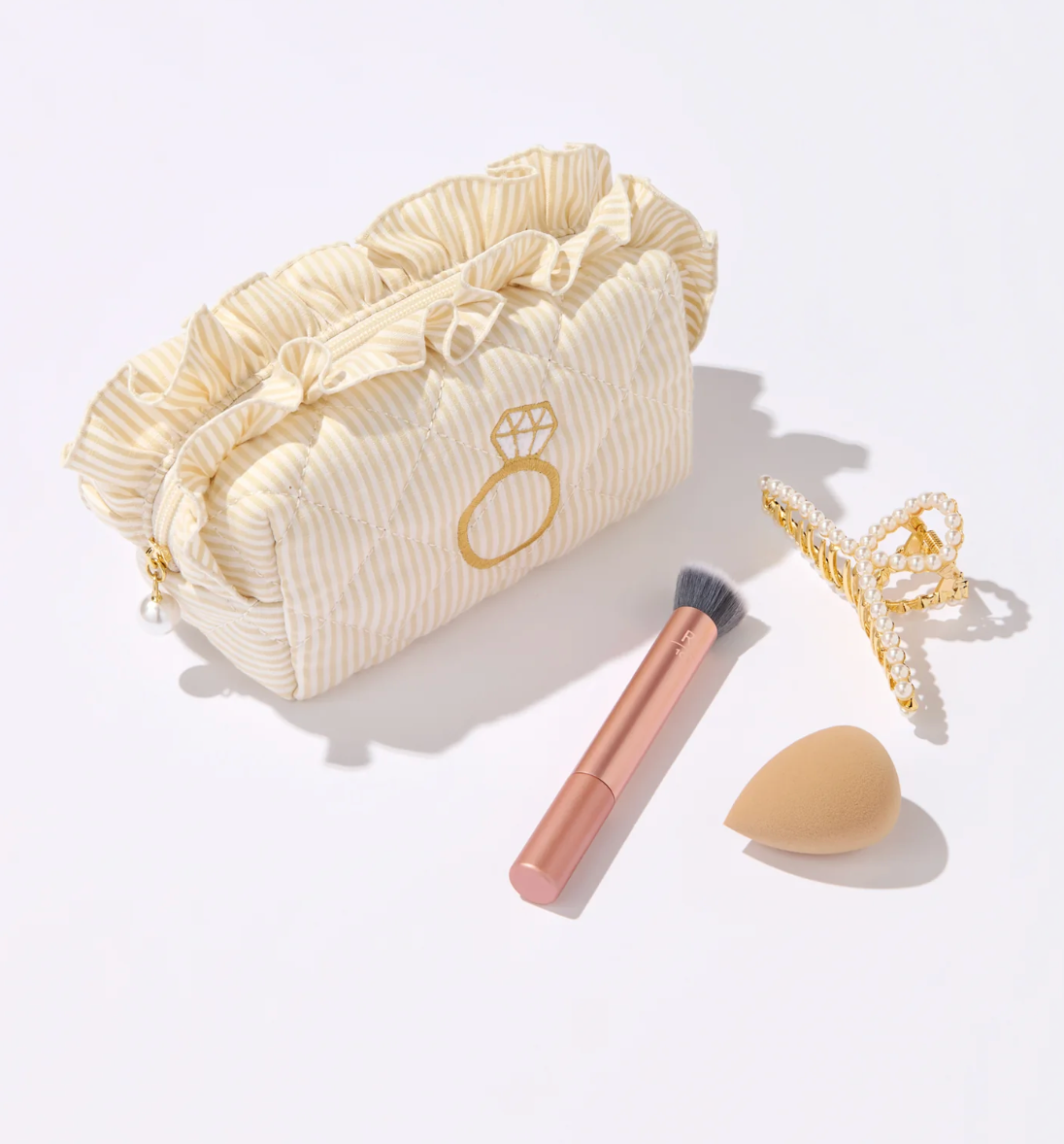 Sweet, sparkly, and full of charm, the Ruffle Bling Small Zip Pouch is a must-have for any bride-to-be or glam girl on the go. Featuring a soft quilted fabric with delicate beige pinstripes and a playful ruffle trim, it’s topped off with a gold embroidered ring and a pearl-accented zipper pull. The top zip closure keeps your beauty musts or little keepsakes secure in style. It’s the perfect accessory for bridal showers, bachelorettes, or everyday sparkle.