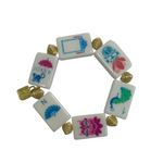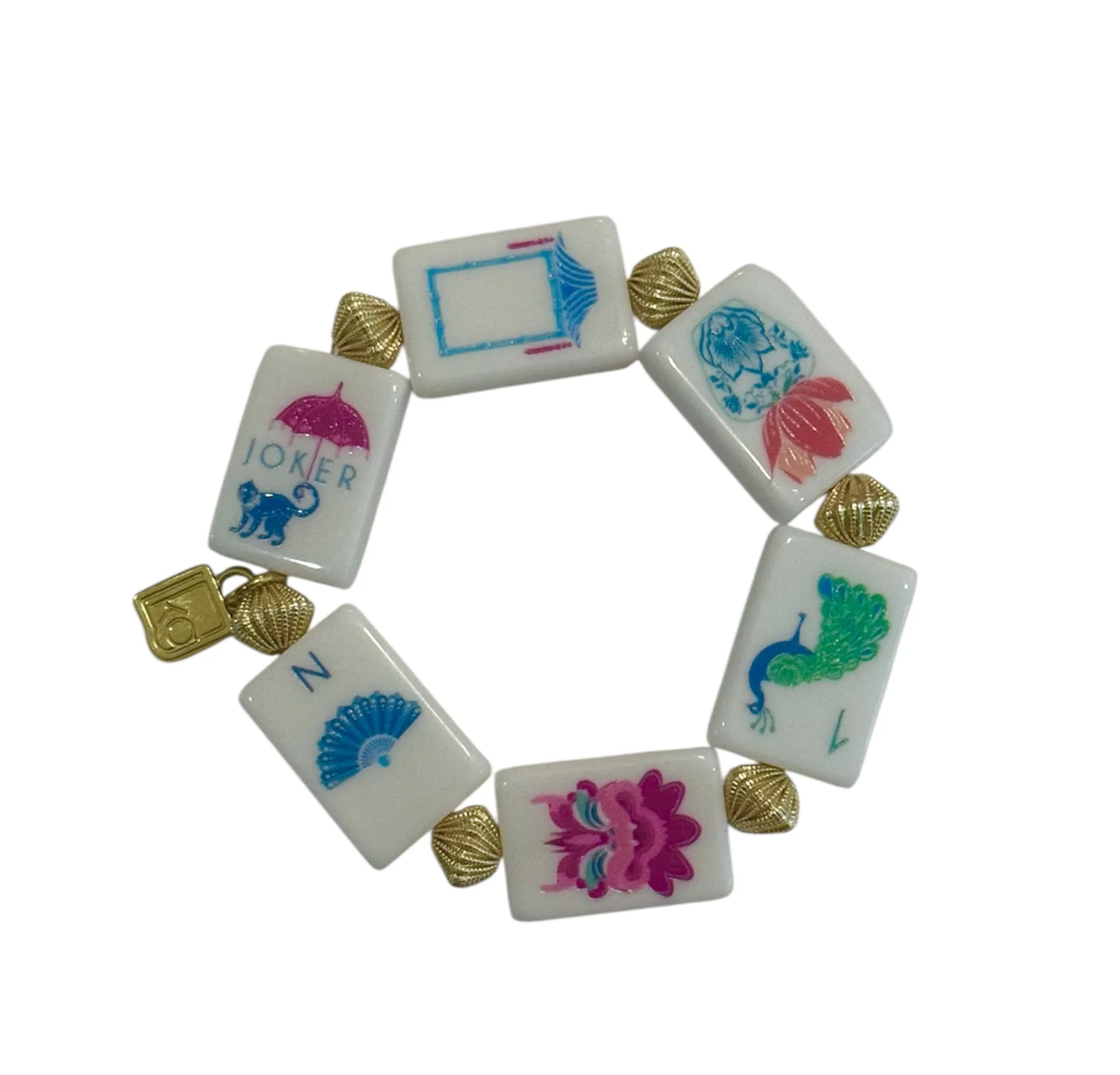 You asked for it! Here they are...our new bracelet style features crisp white tiles with bold jewel tone characters. Textured gold spacers accent the colorful tiles, a playful nod to the traditional game. One size fits most.