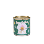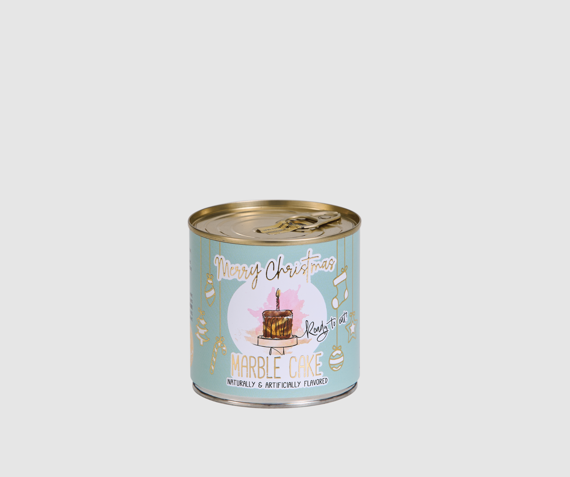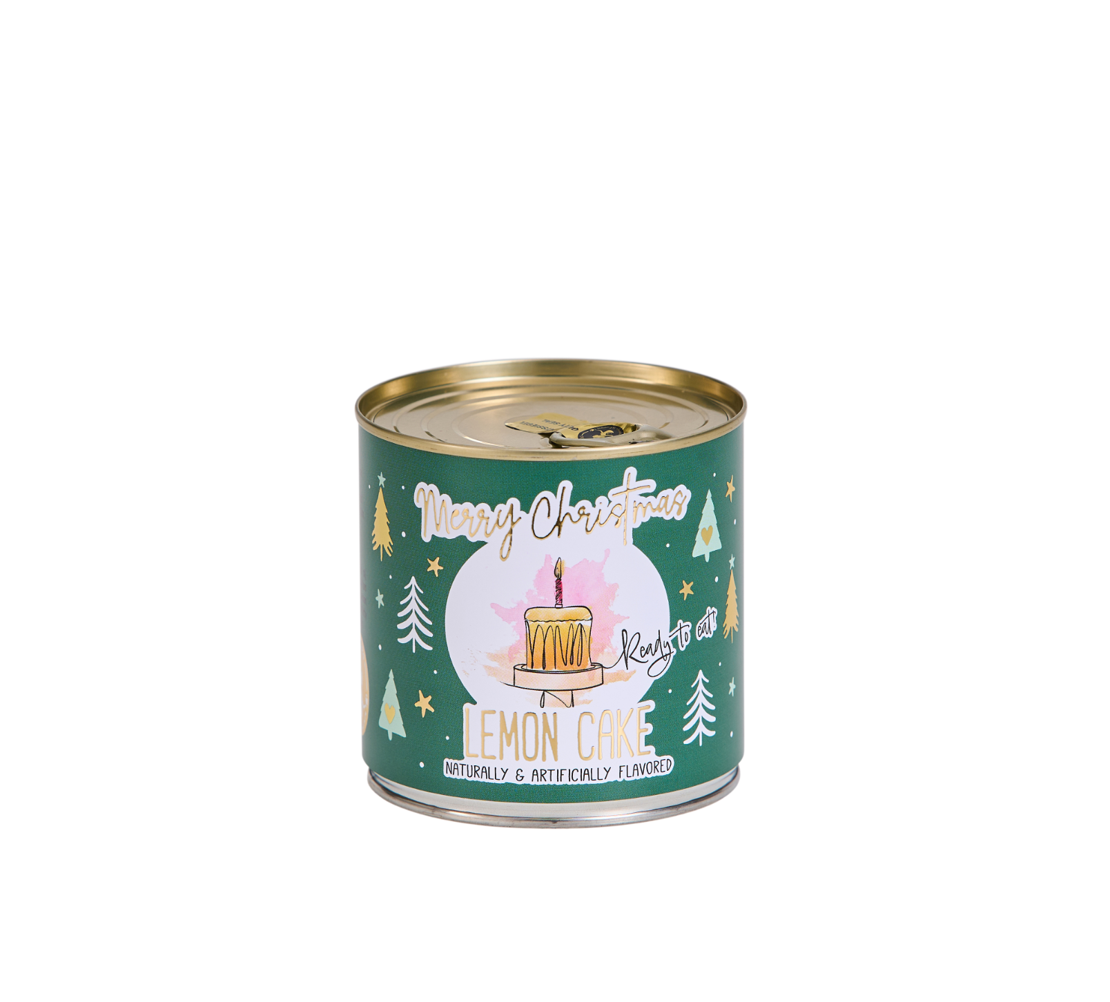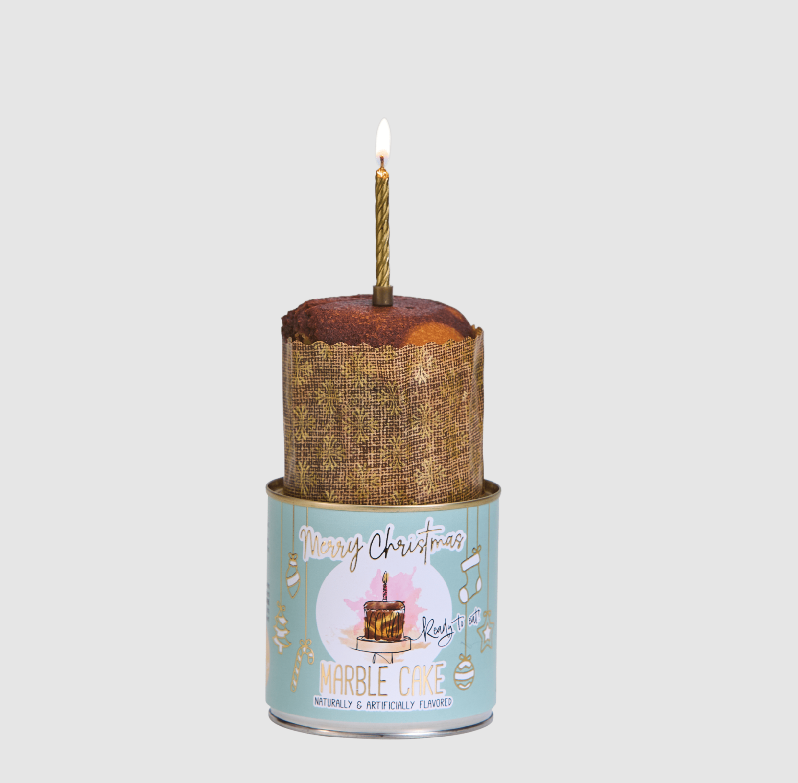 A small, freshly baked cake with a golden candle, made using traditional recipes and baked in a can. This unique treat can remain fresh for up to 18 months and is prepared with care.